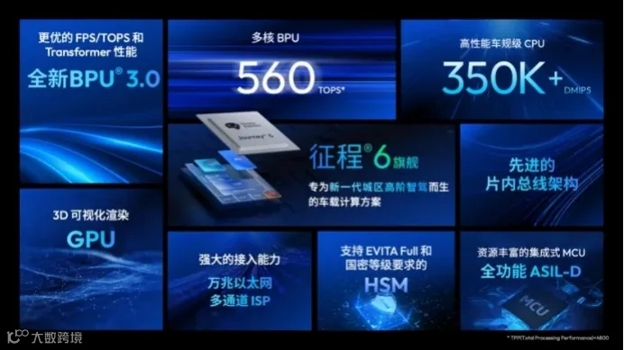 今年上半年,地平线发布最新一代征程6芯片,多达6个版本,其中旗舰版本的征程6P最高可实现560TOPS算力。