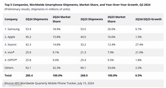 全球市场方面,第二季度苹果手机全球出货量为4520万台,同比仅增长1.5%。排在第三名的小米,则激增27.4%。