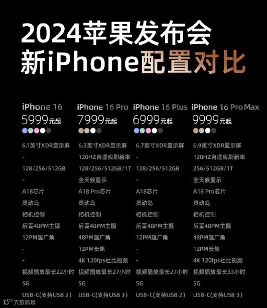 ● iPhone 16售价为5999/6999/8999元,Plus为6999/7999/9999元