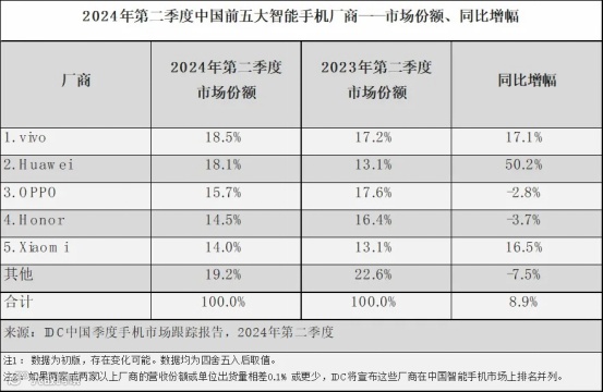 IDC数据显示,今年第一季度,苹果手机在中国大陆出货量从2023年的第一跌至第五(15%市场份额);第二季度,苹果跌出前五,出货量市场份额约为13.6%,环比下降了约9.33%。