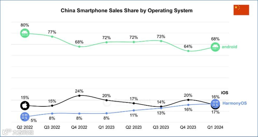 在中国市场,苹果更是四面楚歌。发布会前夕,Counterpoint公布了2024年中国第一季度的操作系统详细数据,华为的鸿蒙系统以微弱优势超越iOS,成为中国第二大移动操作系统。