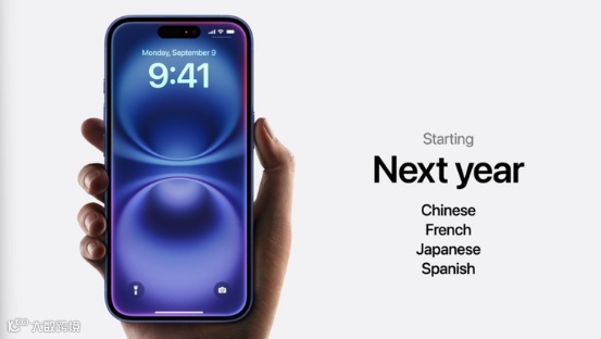 不过,Apple 智能并不会随手机在本月20日首发,英文版本要等到下个月的系统版本更新。另外,中文、日文、法文和西班牙文版本将于明年某个时候推出。