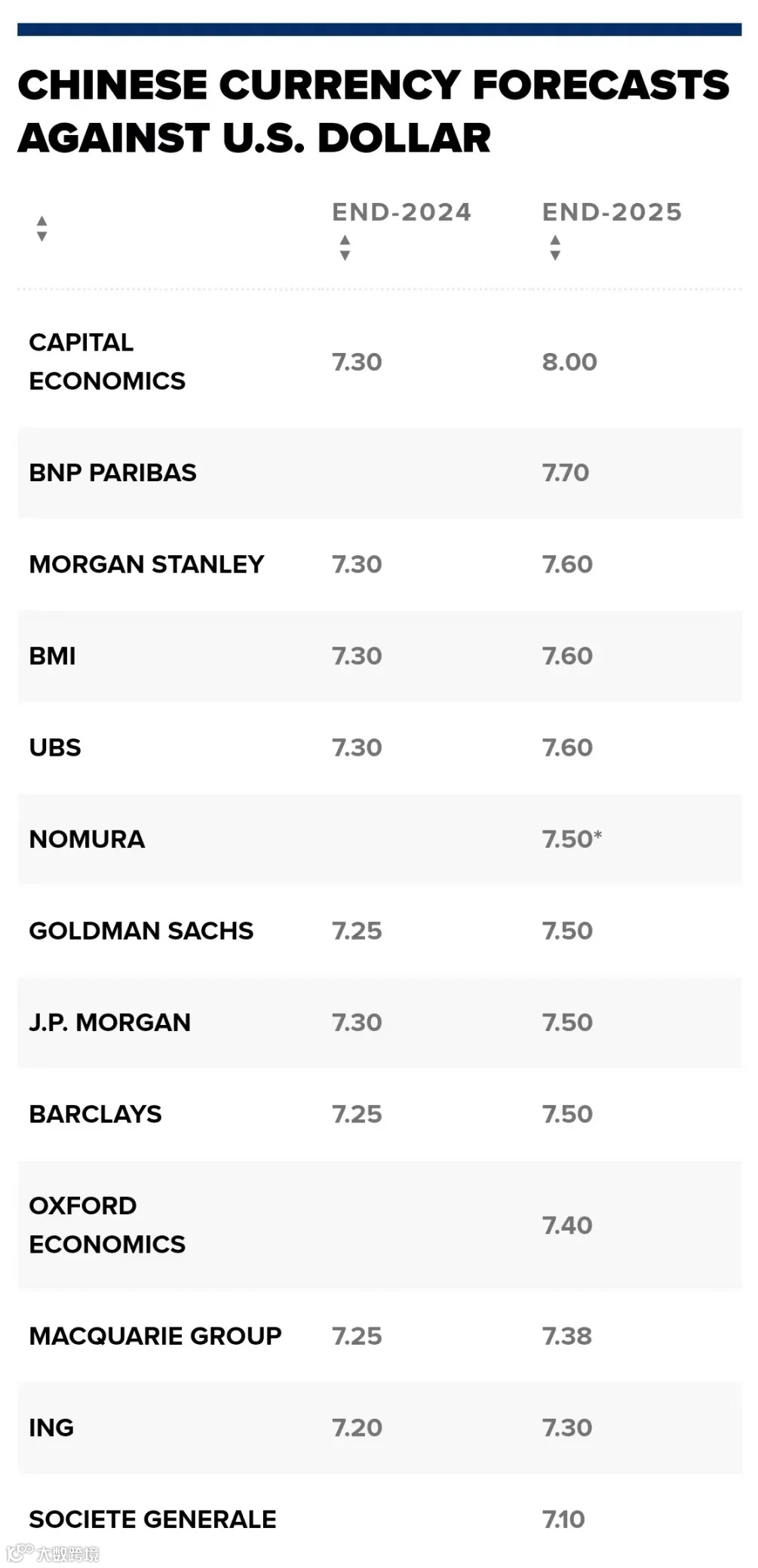 就短期来看,各大机构认为人民币年内不会出现大幅贬值,共识预测目前在7.2~7.3区间,不过,2025年人民币可能进一步走弱。