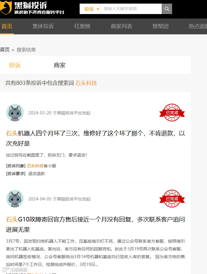 第三,品控堪忧。在新浪黑猫投诉中,关于扫地机器人的投诉目前已经超过6000条。排除掉服务类投诉,多数集中在品控问题上,包括且不限于充不进电、不工作、频繁维修等等。其中,关键词“科沃斯”搜索结果约有3000多条,“石头科技”约800多条。