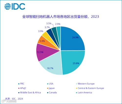 扫地机器人的主要潜力市场在海外。IDC数据显示,2023年全球智能扫地机器人前三大市场分别为中国、美国和西欧,出货量占比分别为24.9%、23.8%和18.7%。另外,亚太市场(不含中国、日本)也有12.5%的份额,日本则为5.9%。