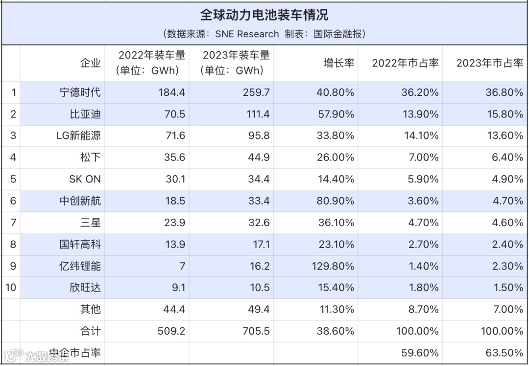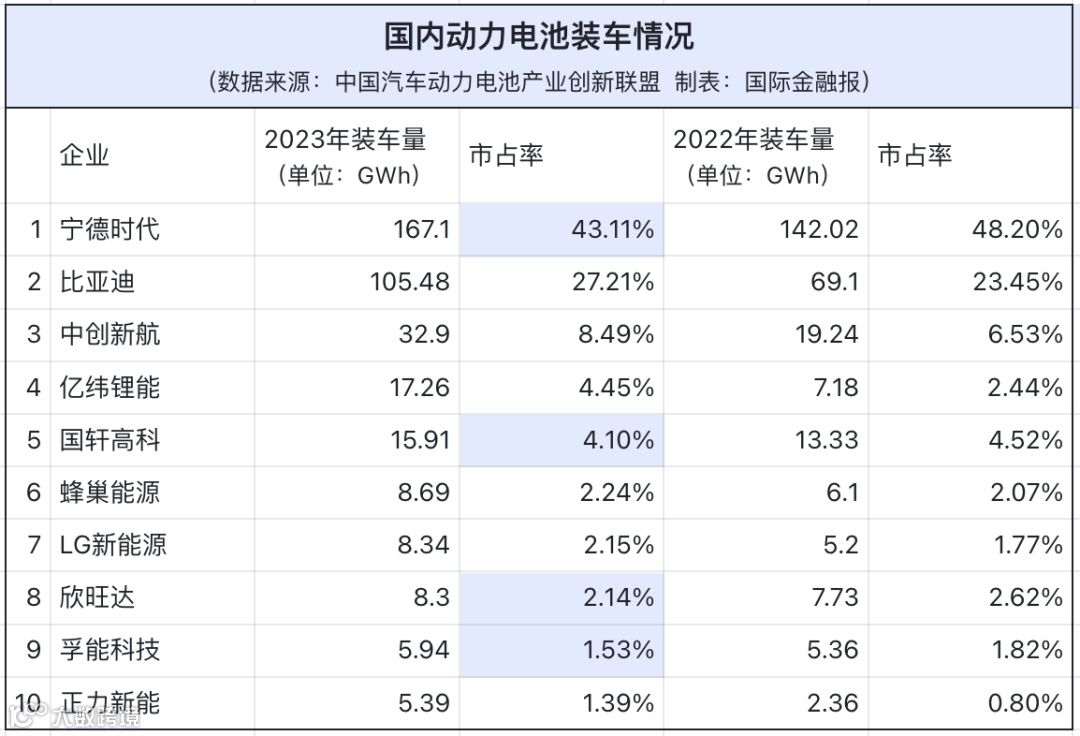对于新能源企业来说,中国是不可忽视的巨大市场。数据显示,2023年中国动力电池装车量达到了387.7GWh,同比增长31.6%,占全球市场份额的55%。其中,宁德时代和比亚迪以较高的市场份额领先,而LG新能源则是前十名中唯一的外企。
