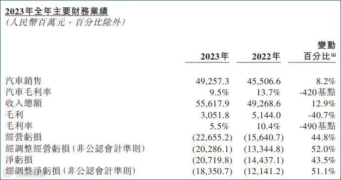 蔚来去年共交付新车160038辆,同比增长30.7%,但这一数据的增速已经是连续3年放缓了。结合同年183.507亿元的经调整净亏损,蔚来平均每卖出一辆车就要亏11.47万元。与此同时,蔚来新车的销售成本也水涨船高,达到525.661亿元,同比增长19.1%;汽车毛利率9.5%,连续第二年下滑,还不到2021年的一半(20.1%)。