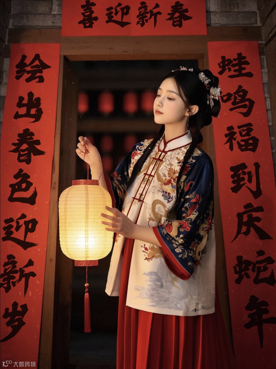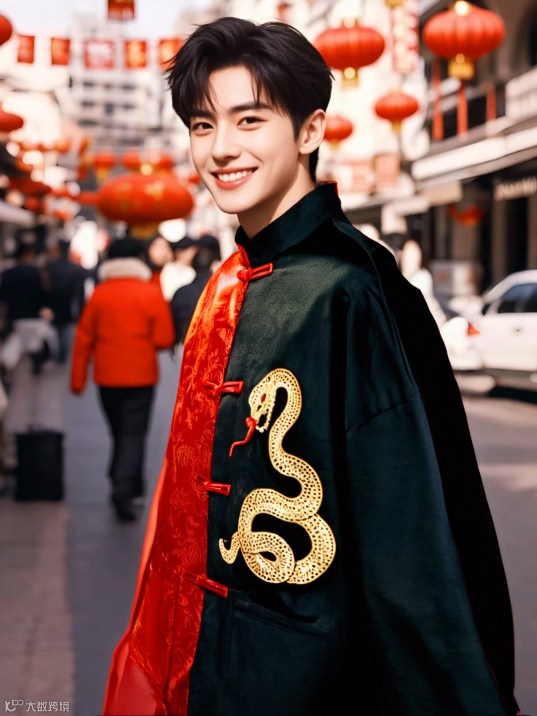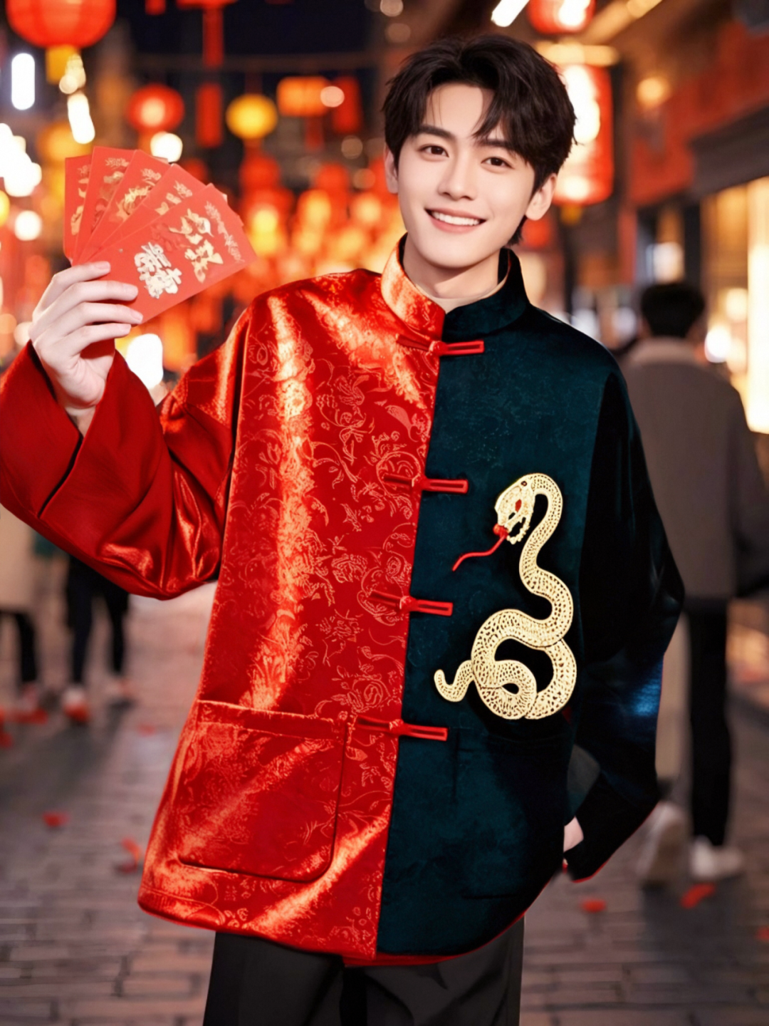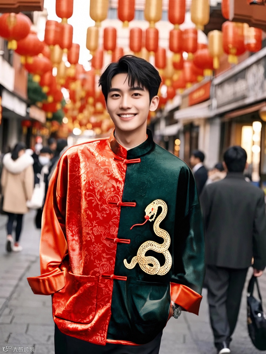 创作思路:因为是蛇年,所以希望在衣服上体现蛇年的元素,运用AI工具生成蛇元素的两套服装和背景,后期使用了ps将春联结合绘蛙做了一个藏头对联,首尾呼应。