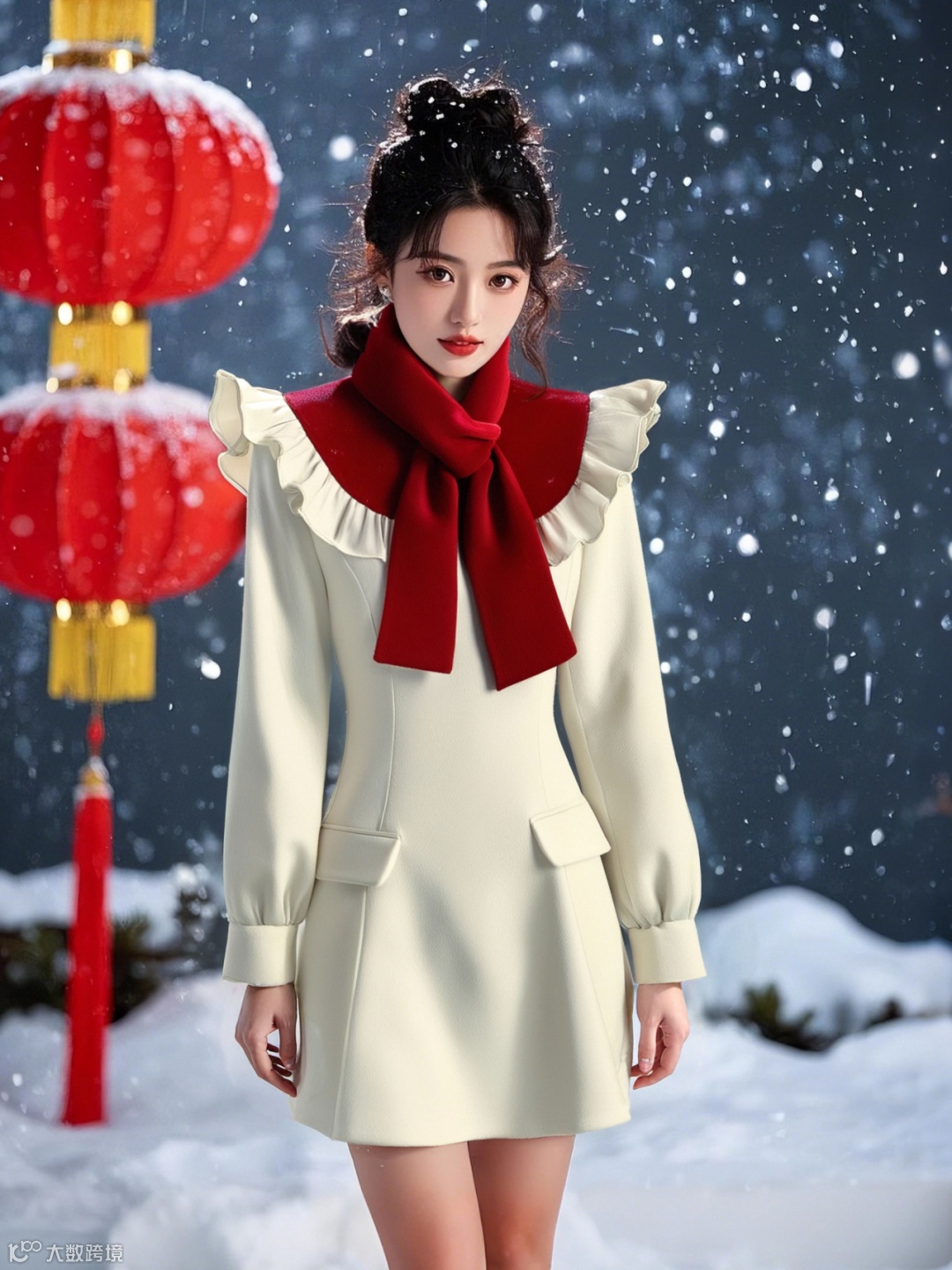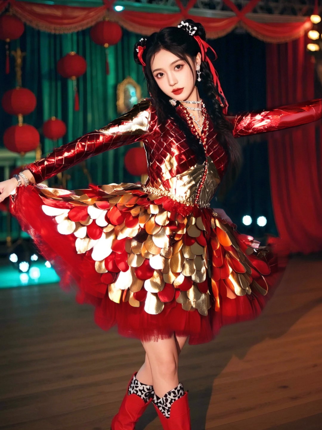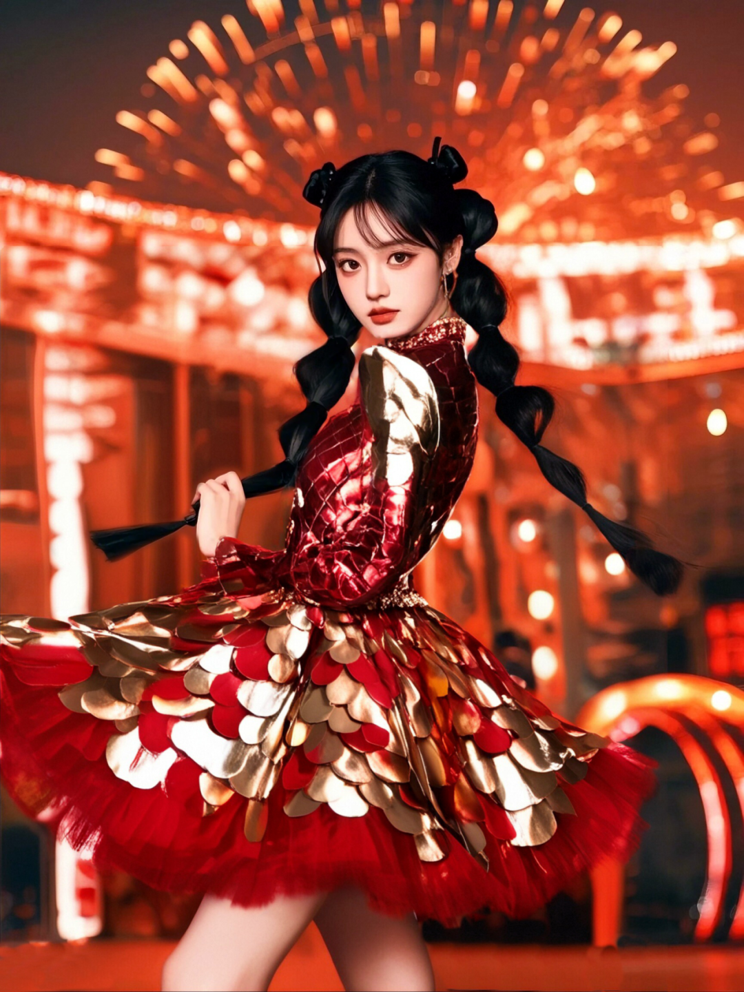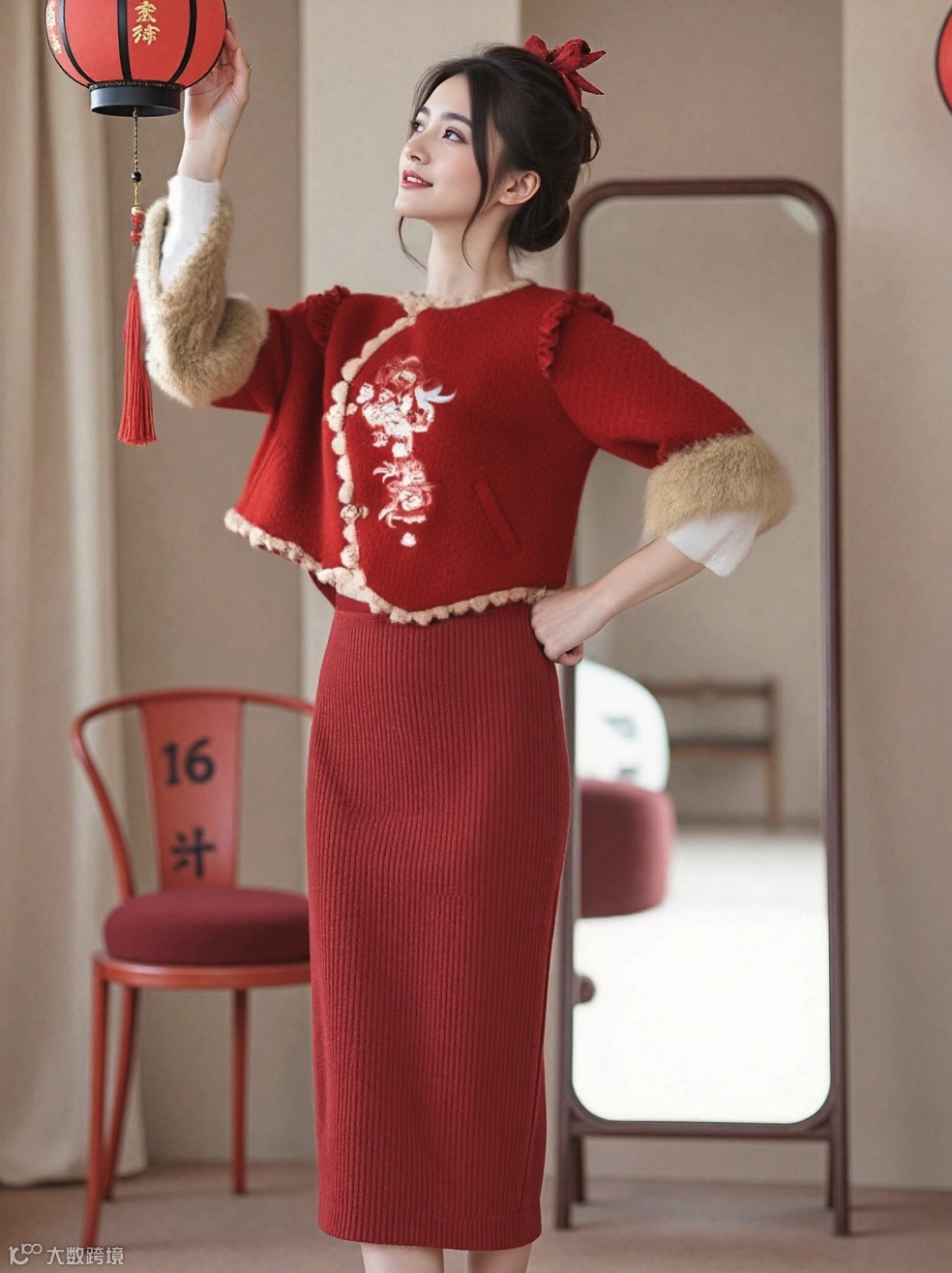 创作思路:以新年穿搭为主题进行服装搭配,进行了衣服原创设计及生成参考图,首先是衣服款式要有设计感要好看,其次是参考图需要有一些氛围感,模特也需要符合整体风格及搭配。