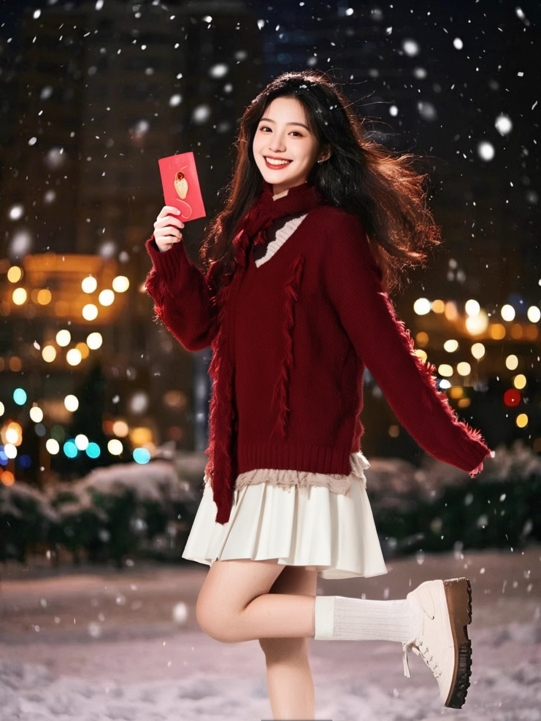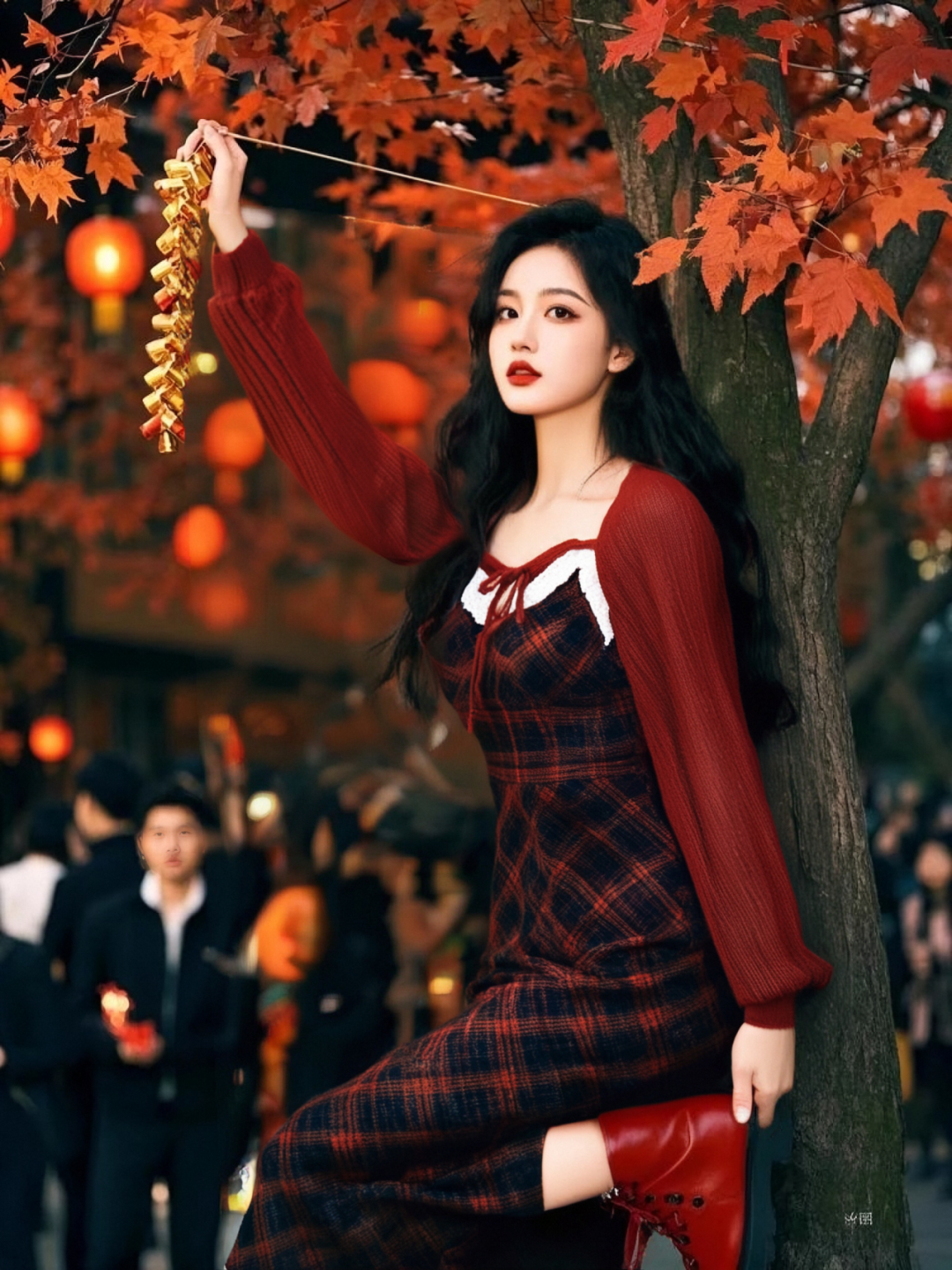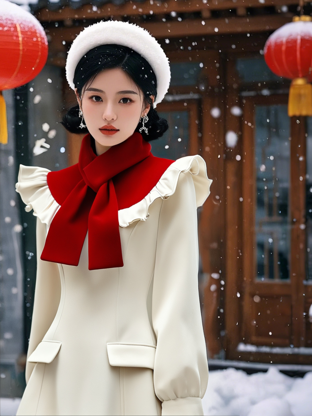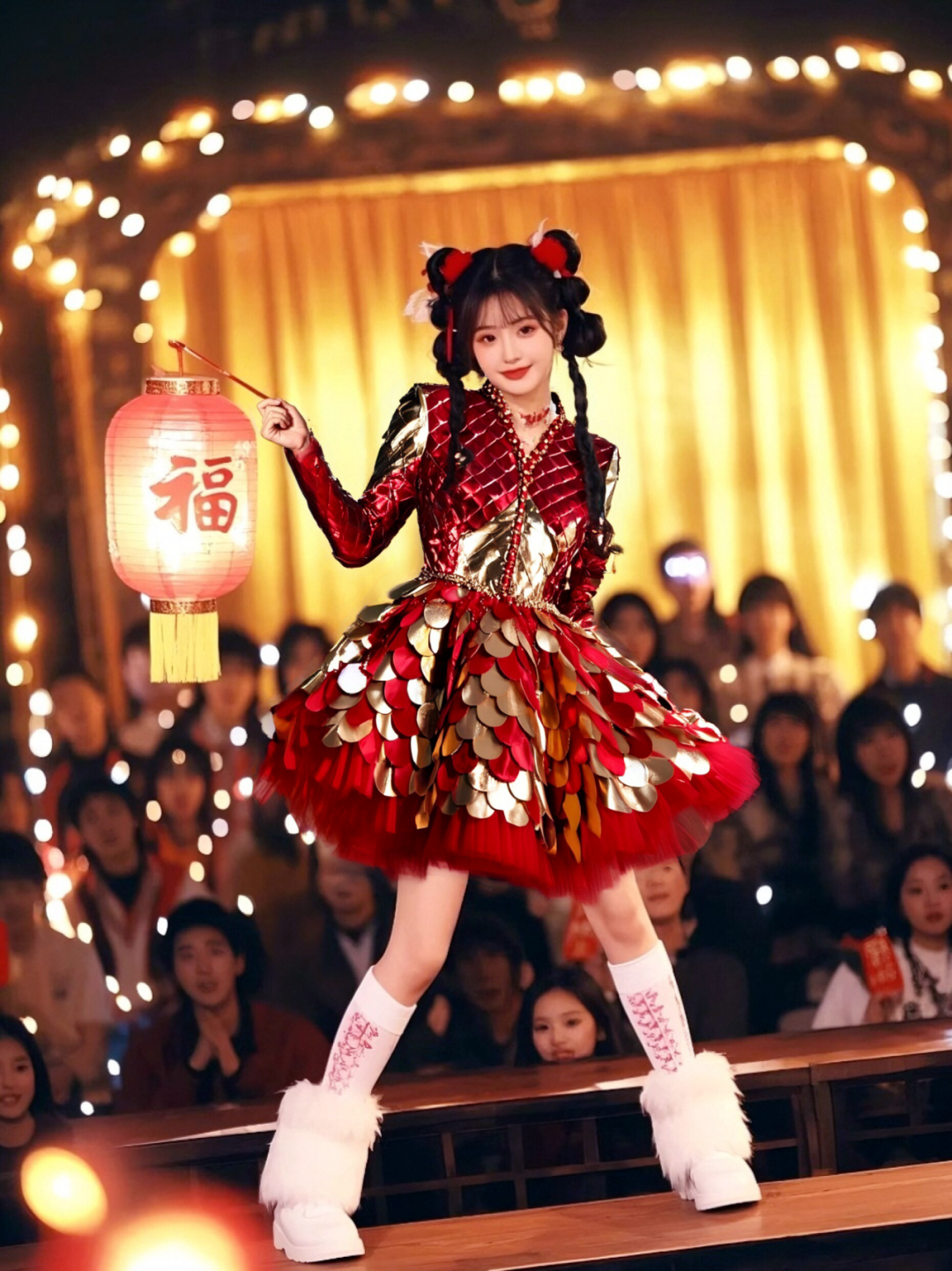 创作思路:以新年穿搭为主题进行服装搭配,进行了衣服原创设计及生成参考图,首先是衣服款式要有设计感要好看,其次是参考图需要有一些氛围感,模特也需要符合整体风格及搭配。