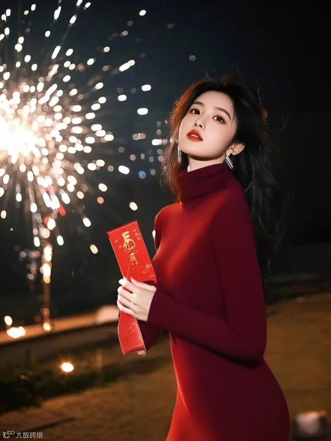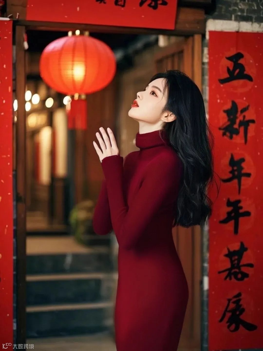 创作思路:以新春主题风格的写真图入手,寻找充满年味的创意感参考图。背景图以红、黄、橘色为主色调,画面多以灯笼、红包、对联等新春元素来增加节日氛围;服装选择以新春经典颜色为主,选用白色为主色红色点缀的裙装,避免服装与背景融为一体。
