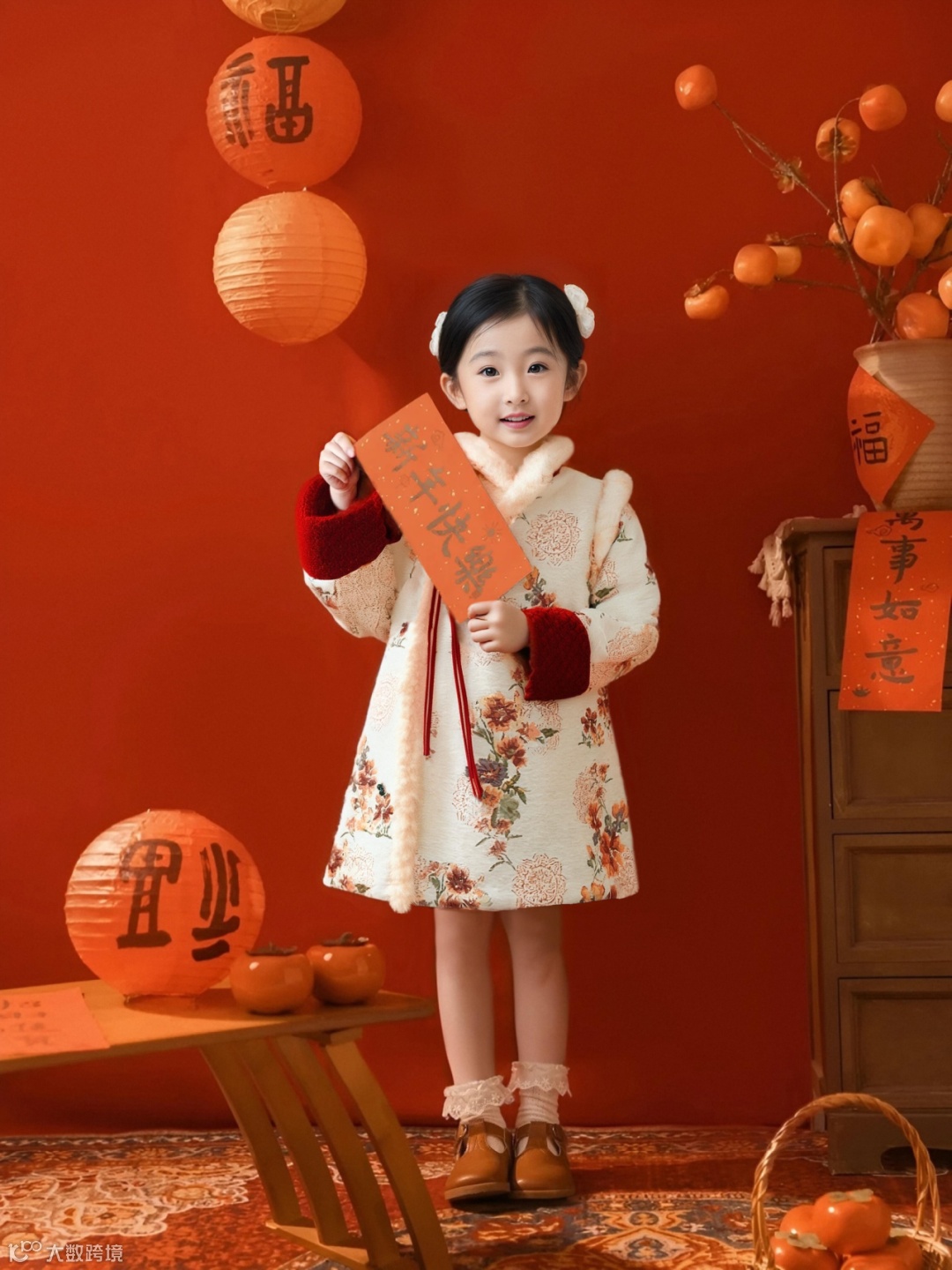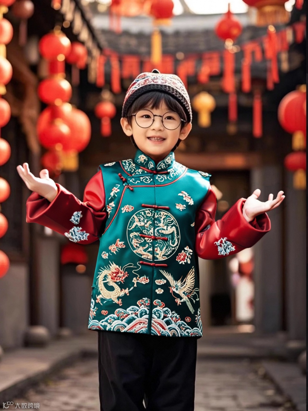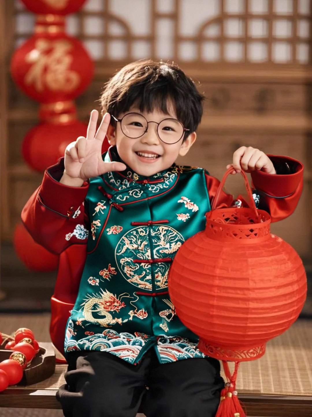 创作思路:此次服装设计旨在将传统中式元素与现代儿童时尚相结合。通过鲜艳的色彩搭配展现节庆气氛,丰富的刺绣图案传达文化内涵。设计针对儿童的活动需求,确保舒适与美观兼备。同时,加入互动道具加强服装的趣味性,鼓励儿童在穿着中自信表达。