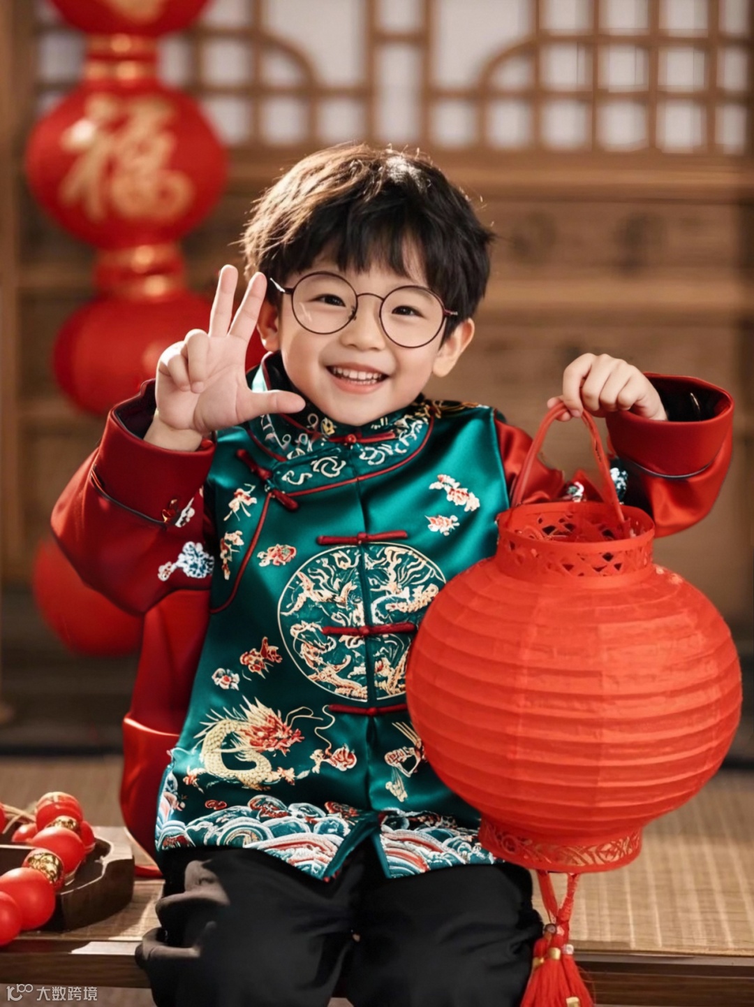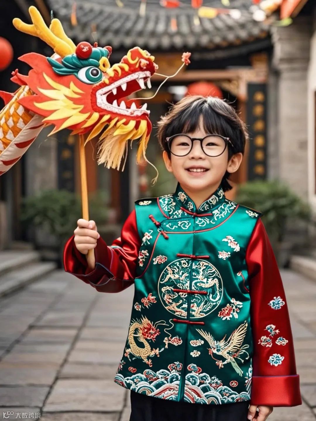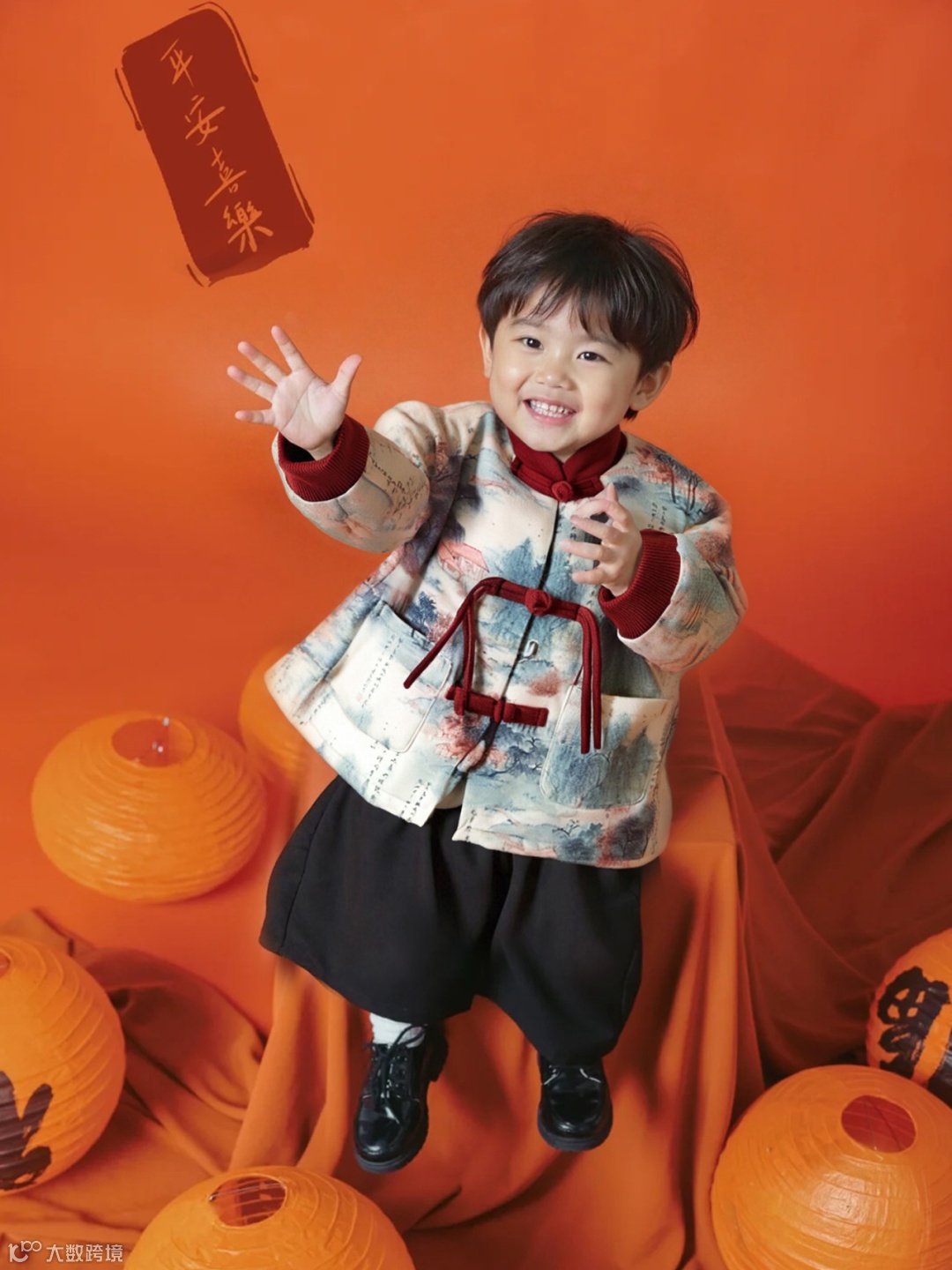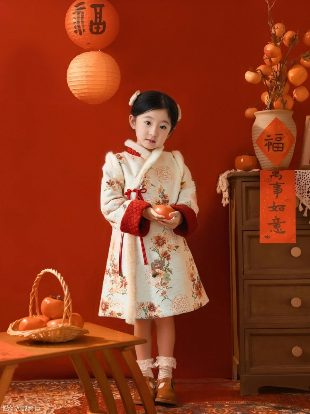 创作思路:此次服装设计旨在将传统中式元素与现代儿童时尚相结合。通过鲜艳的色彩搭配展现节庆气氛,丰富的刺绣图案传达文化内涵。设计针对儿童的活动需求,确保舒适与美观兼备。同时,加入互动道具加强服装的趣味性,鼓励儿童在穿着中自信表达。