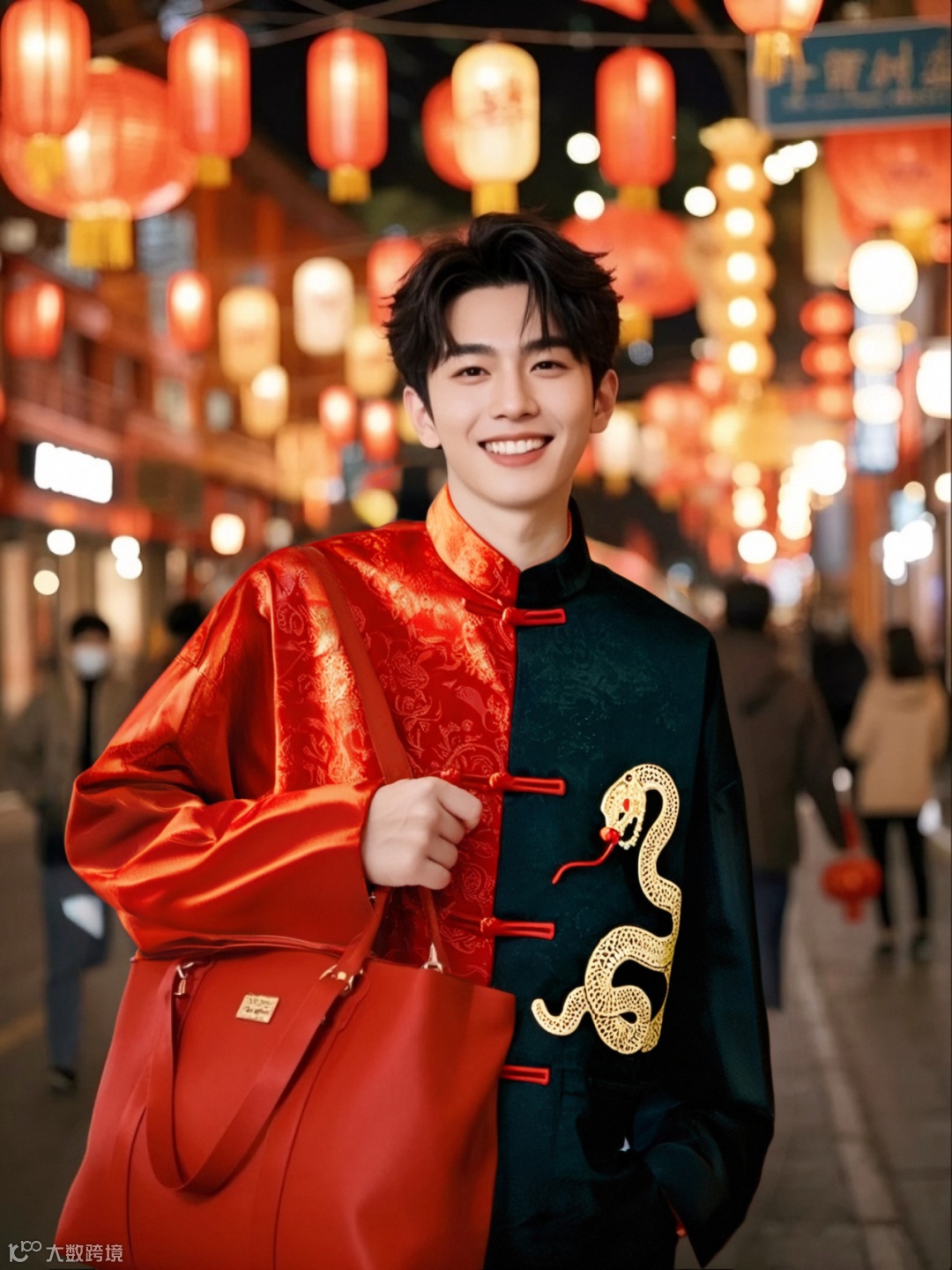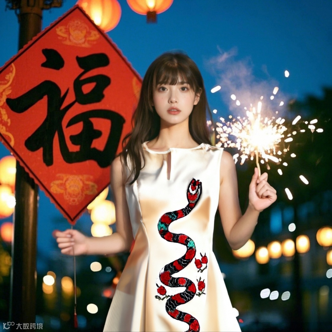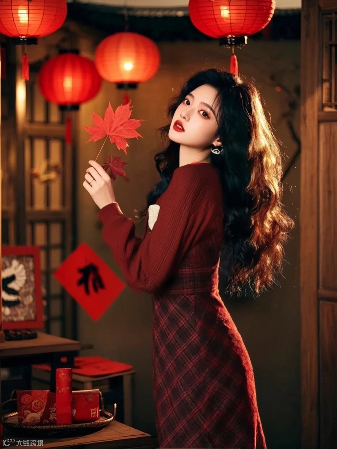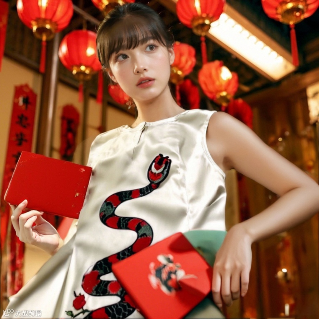 创作思路:场景是搭配一些新年的元素,渲染新年氛围。找到合适的风格图去进行AI生图, 确保没有版权问题;比如用一些AI产品图生图,加入一些新年的元素prompt,再用绘蛙进行服装上身或者是商品重绘;手部缺手指可以用手部修复,袖子用了局部重绘,修复精致;最后ps修图达到能上淘宝的效果。