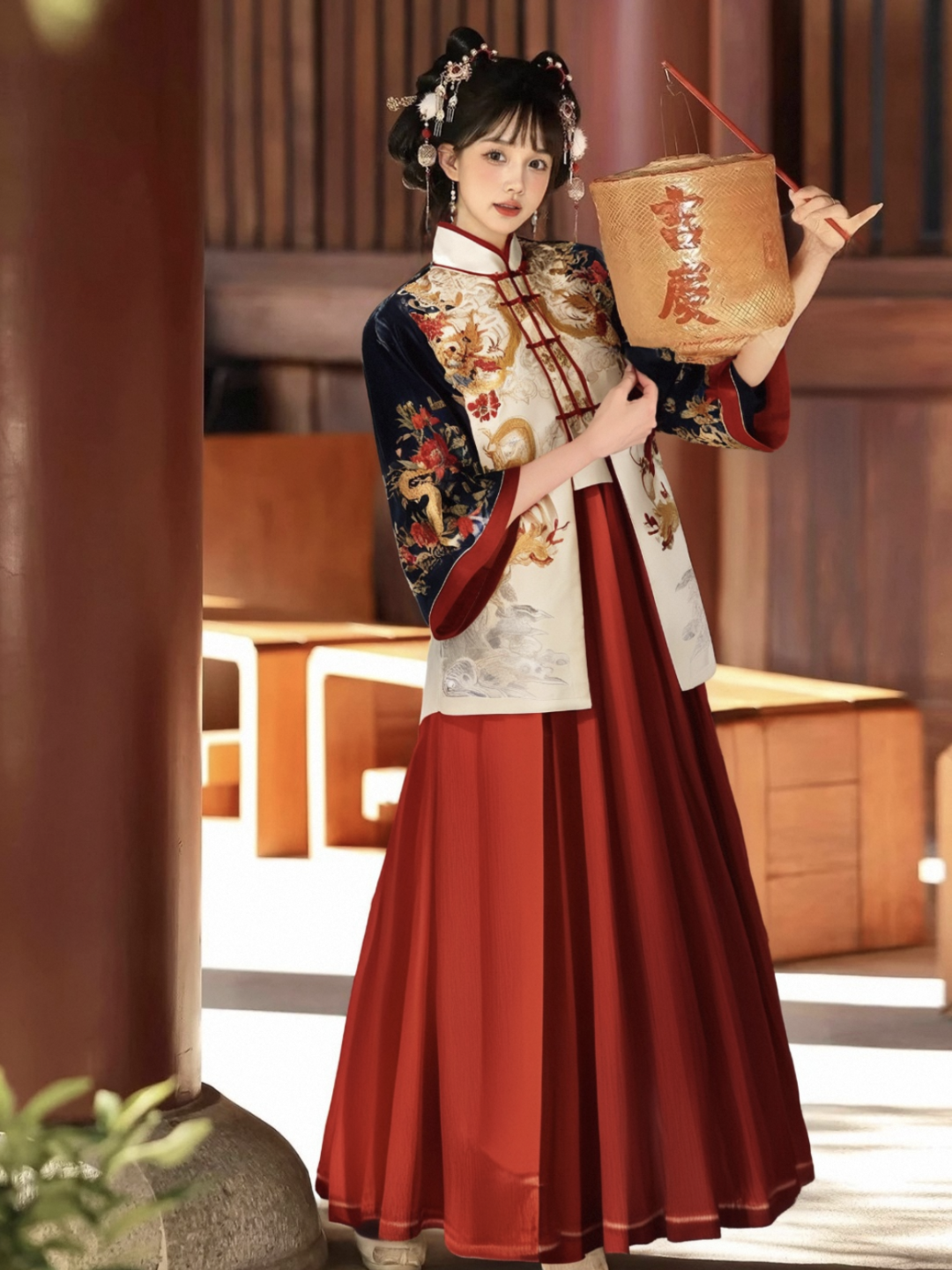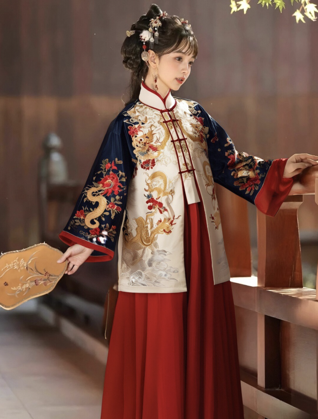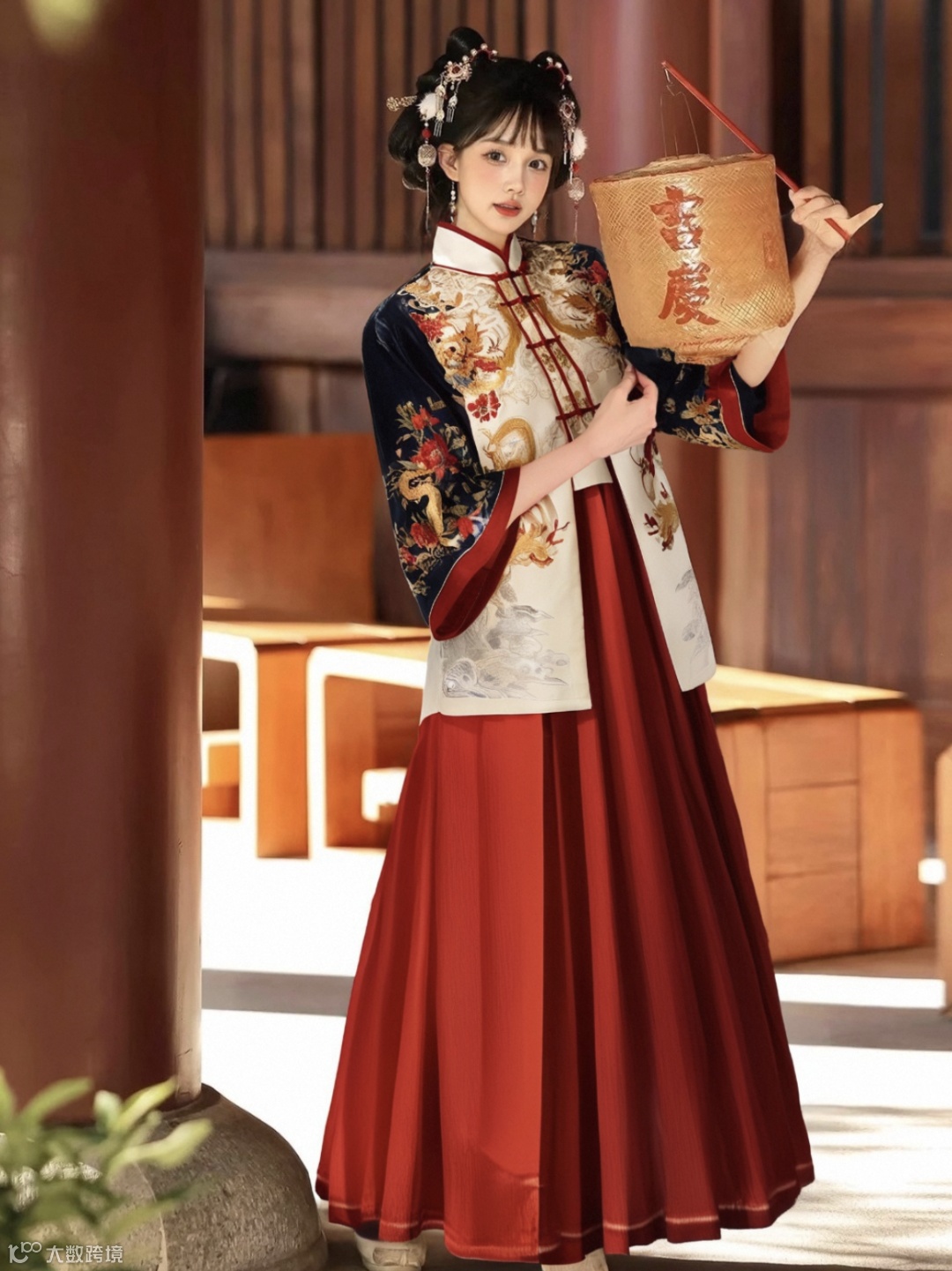 创作思路:宣扬传统服饰,并加入新鲜元素,组合成为新中式的服装搭配。都是先用的绘蛙中的服装上身,再挑选合适的参考图,并用了Ai修复工具修复了手以及ai换模特。呈现出的“梅花香自苦寒来”寓意新年万事胜意,平安喜乐。
