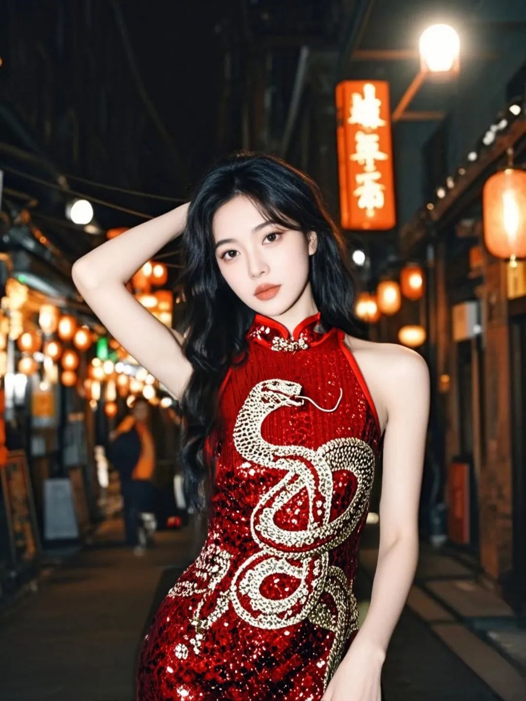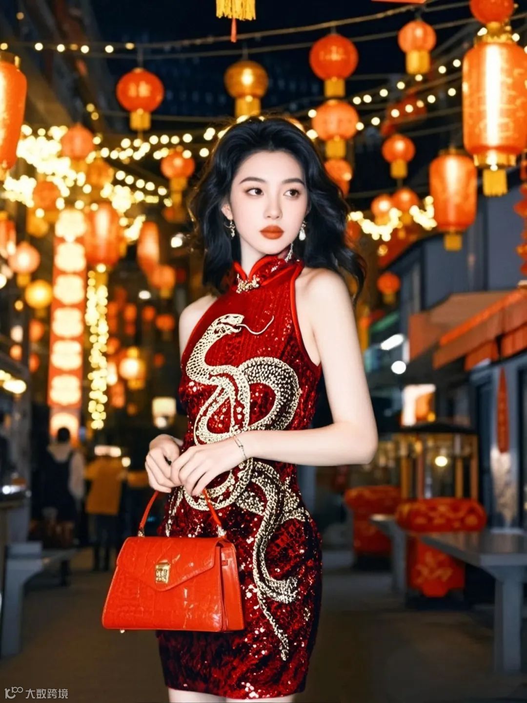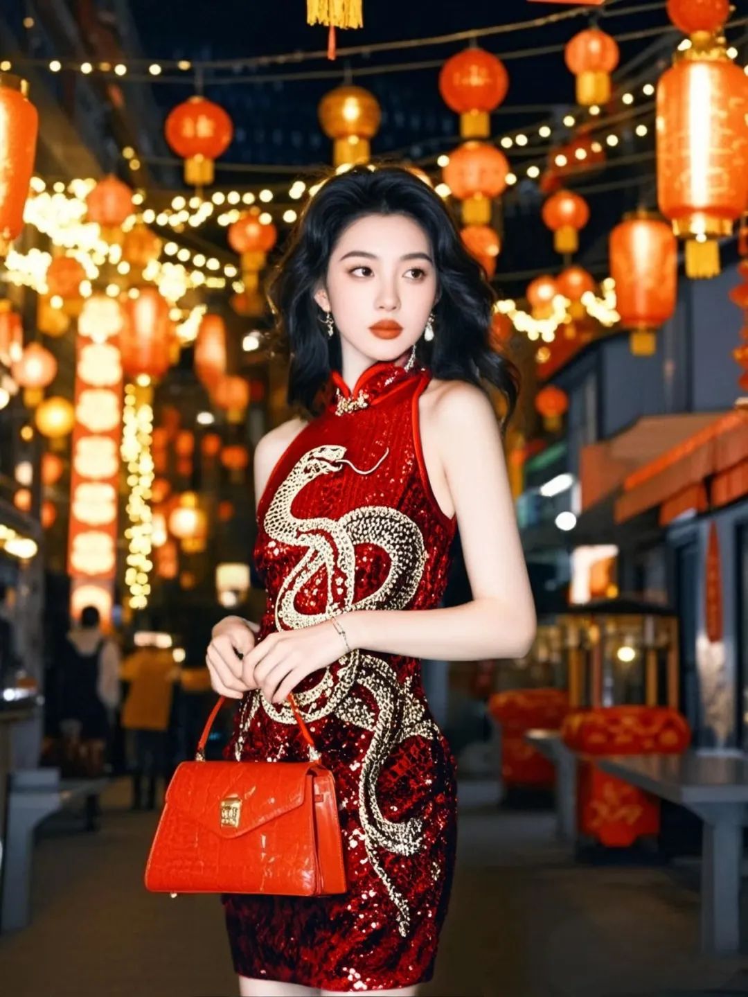 创作思路:这款以蛇鳞片为灵感的新年战袍,采用中国红设计,鳞片自带光泽和反光效果,仿佛让衣服自身散发光芒。无论是参加简约的晚会,还是出门“炸街”,它都能让你成为最耀眼的焦点!
