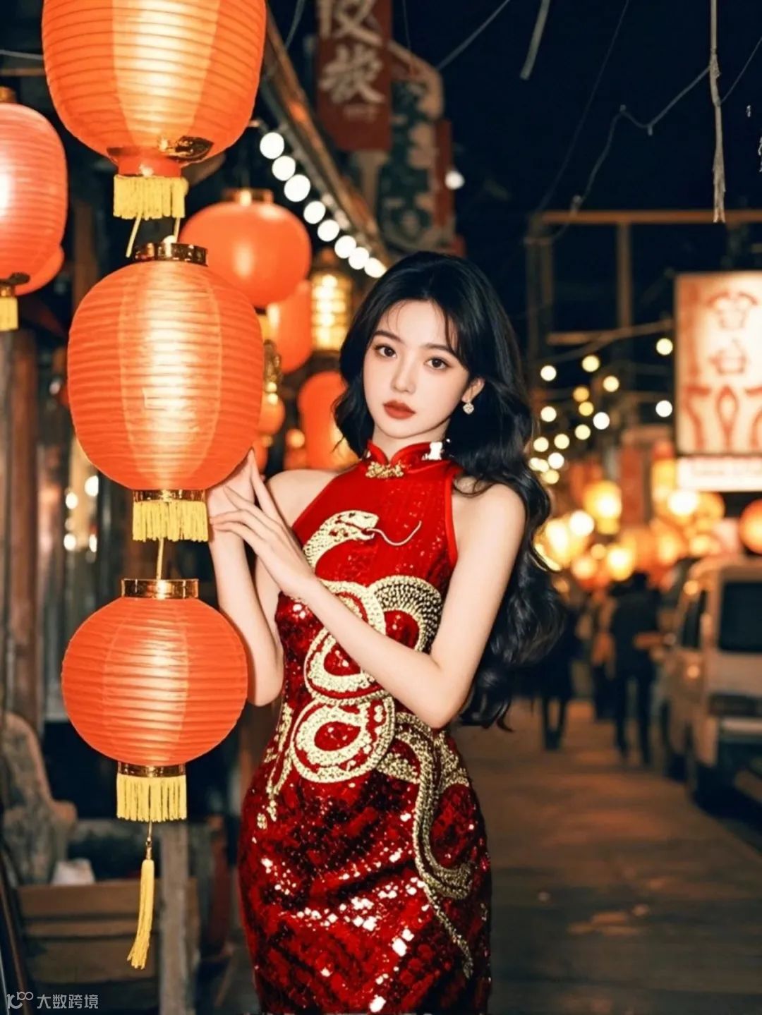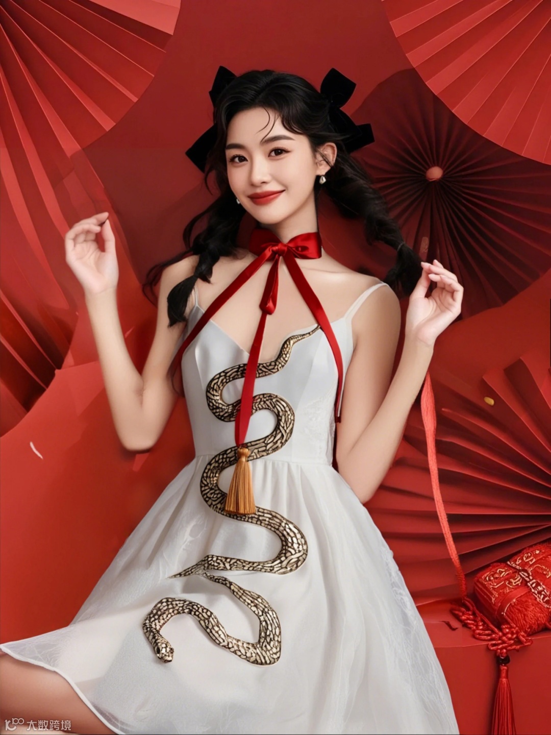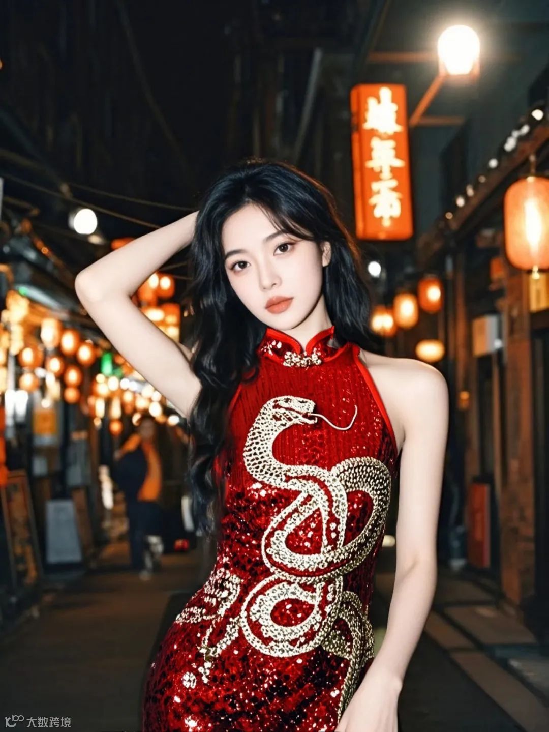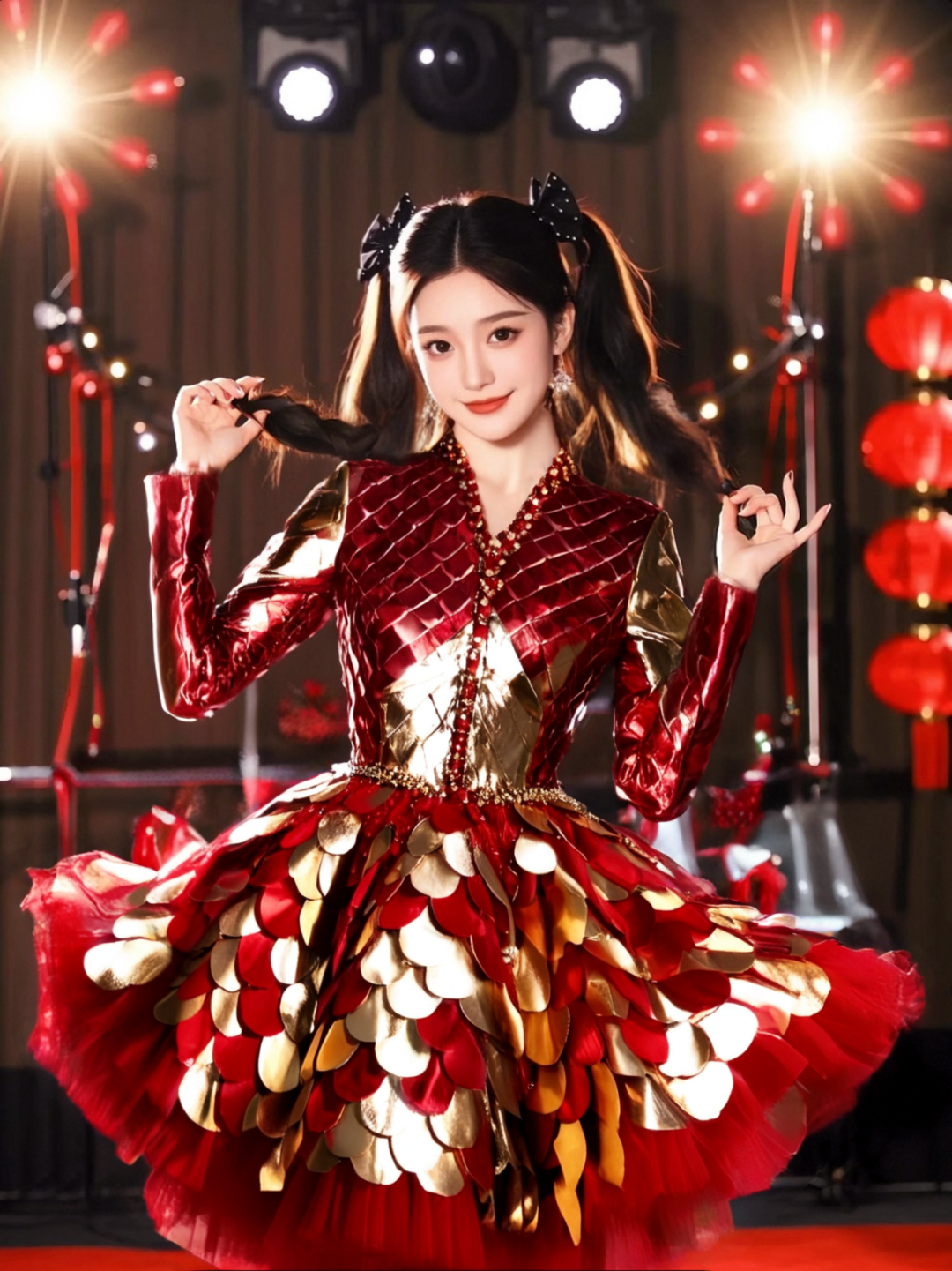 创作思路:这款以蛇鳞片为灵感的新年战袍,采用中国红设计,鳞片自带光泽和反光效果,仿佛让衣服自身散发光芒。无论是参加简约的晚会,还是出门“炸街”,它都能让你成为最耀眼的焦点!