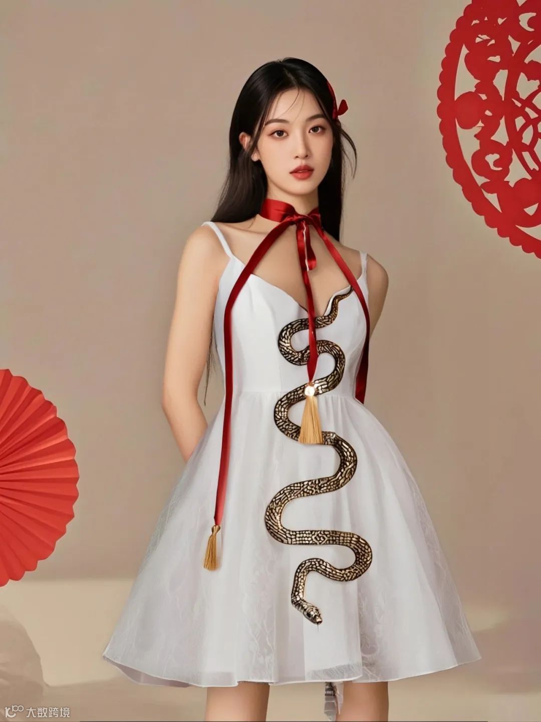 创作思路:蛇年元素,新春喜庆,考虑适用场景:新春出游、新春聚会、新春庆典....... 因此,旗袍配色:白×金;红×金。采用纹理:传统蛇纹、龙蛇纹、祥云蛇纹,以及进一步创新。