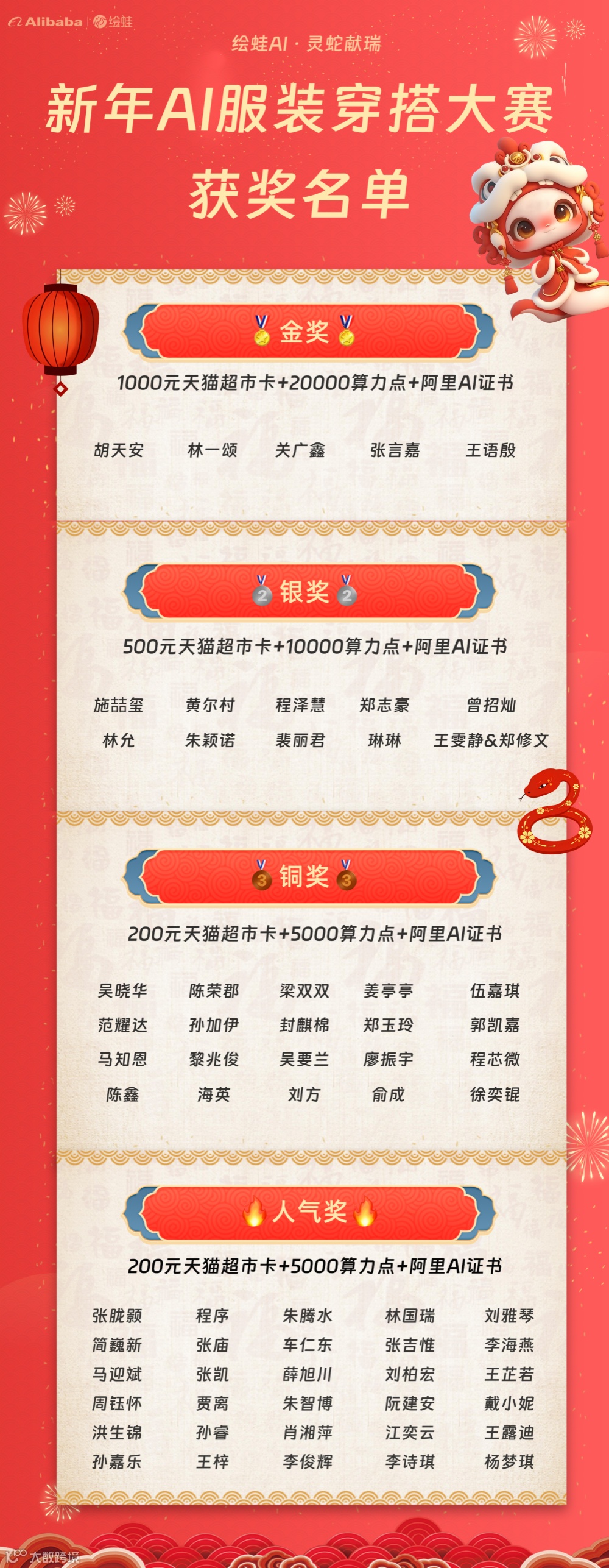 感谢您热情参与和支持「阿里巴巴·绘蛙」新年AI服装穿搭大赛!评审团已根据评选标准进行了综合打分,最终获奖结果现已出炉!