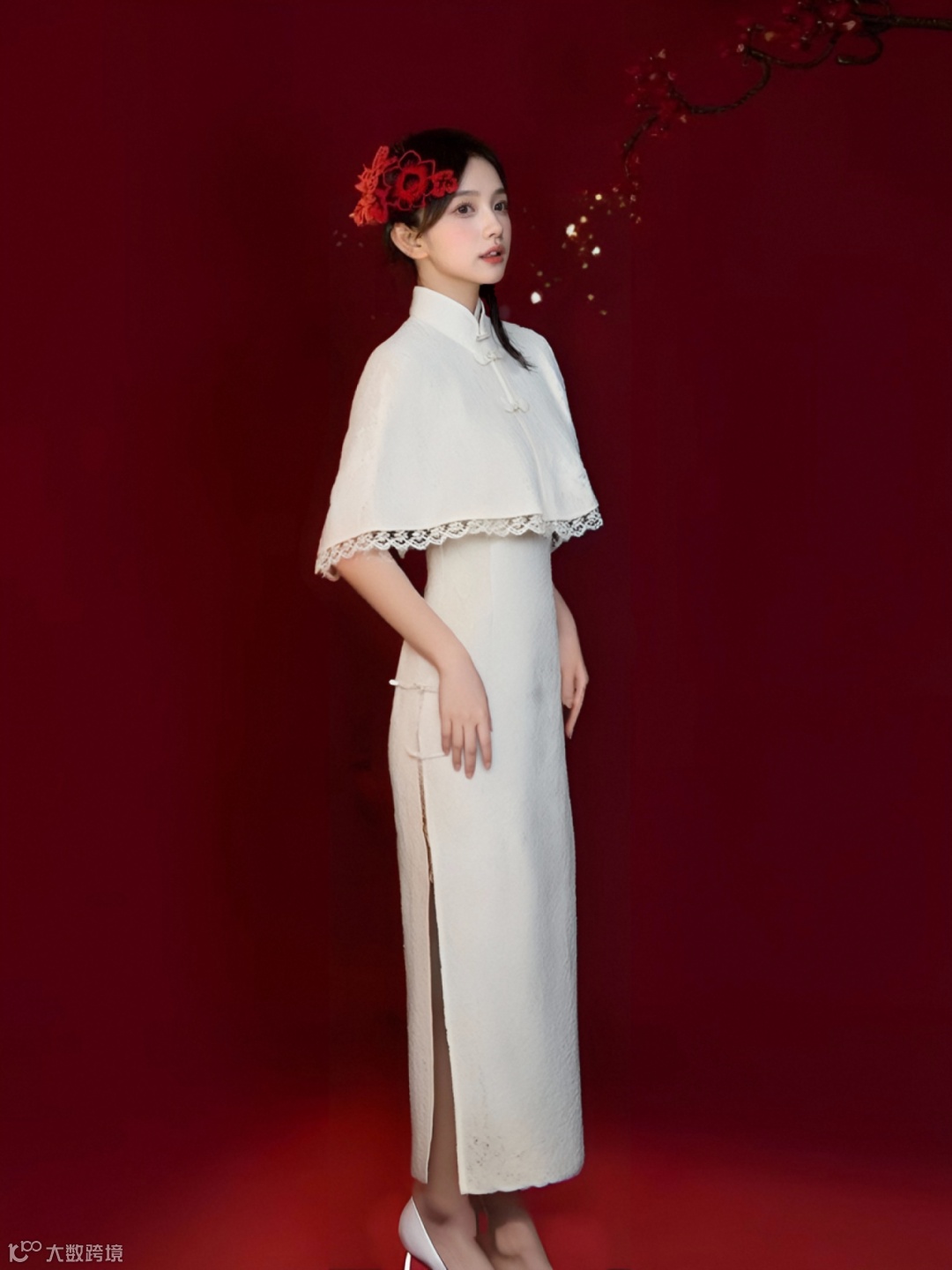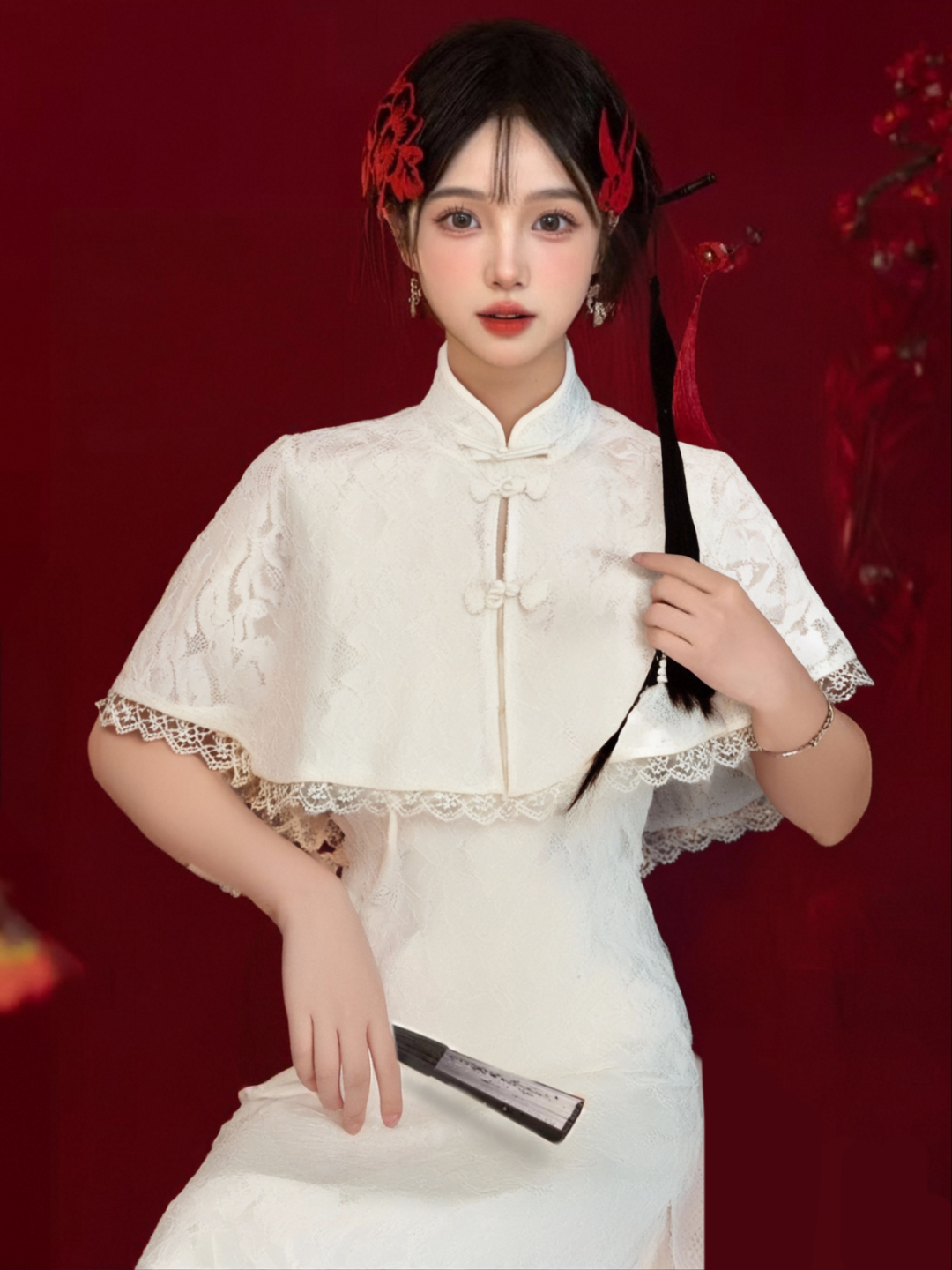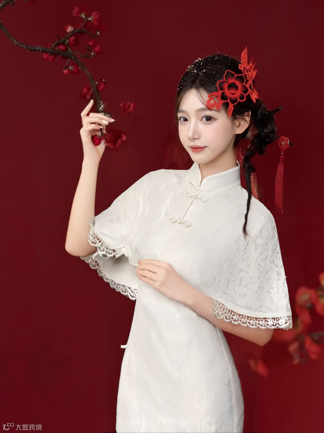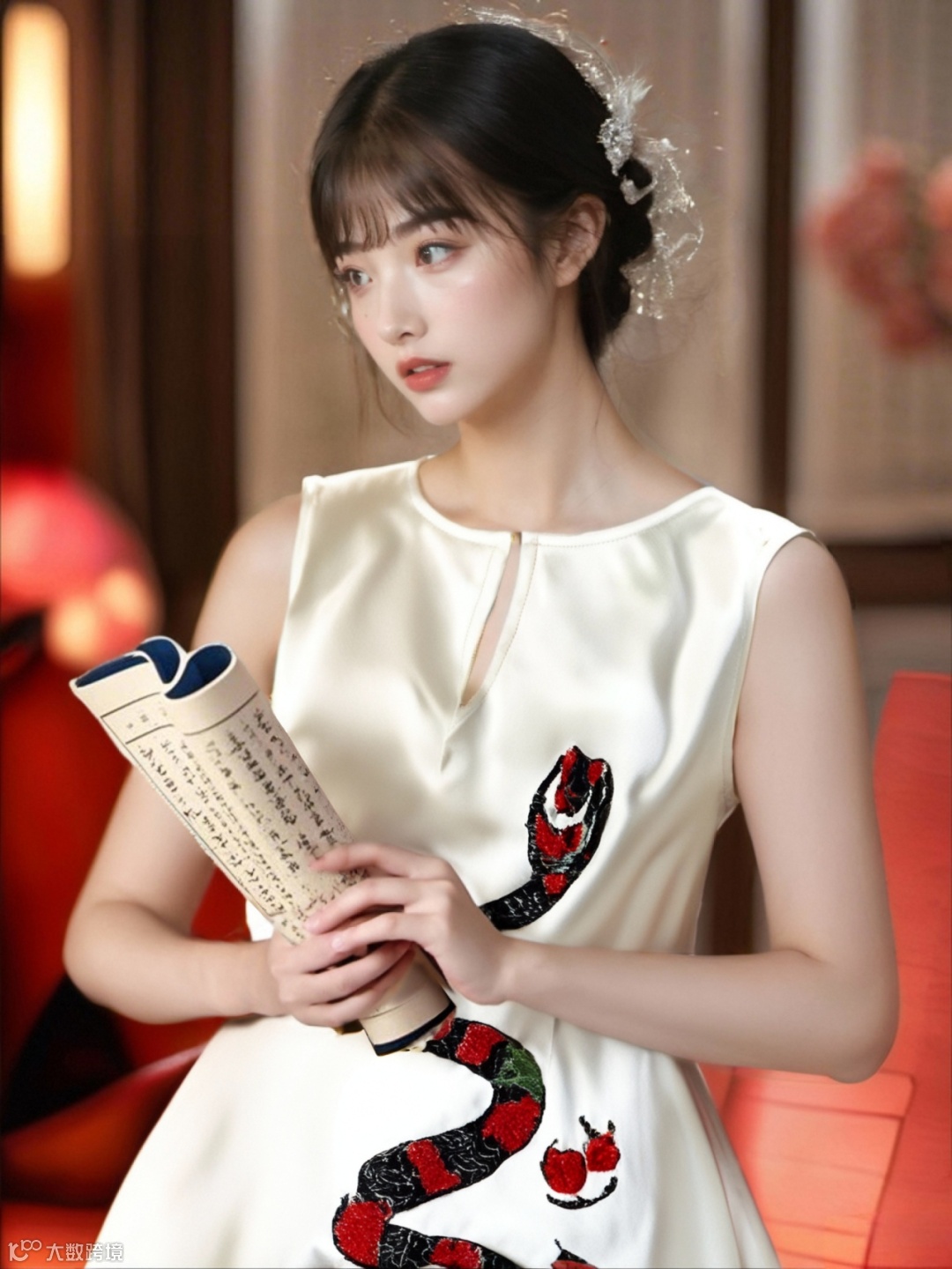 创作思路:希望在以红为主色调的氛围中,增添一丝中国服饰独有的丝绸质感和江南气息。以纯洁的白色和蛇形刺绣为主,让画面更加安静美好。