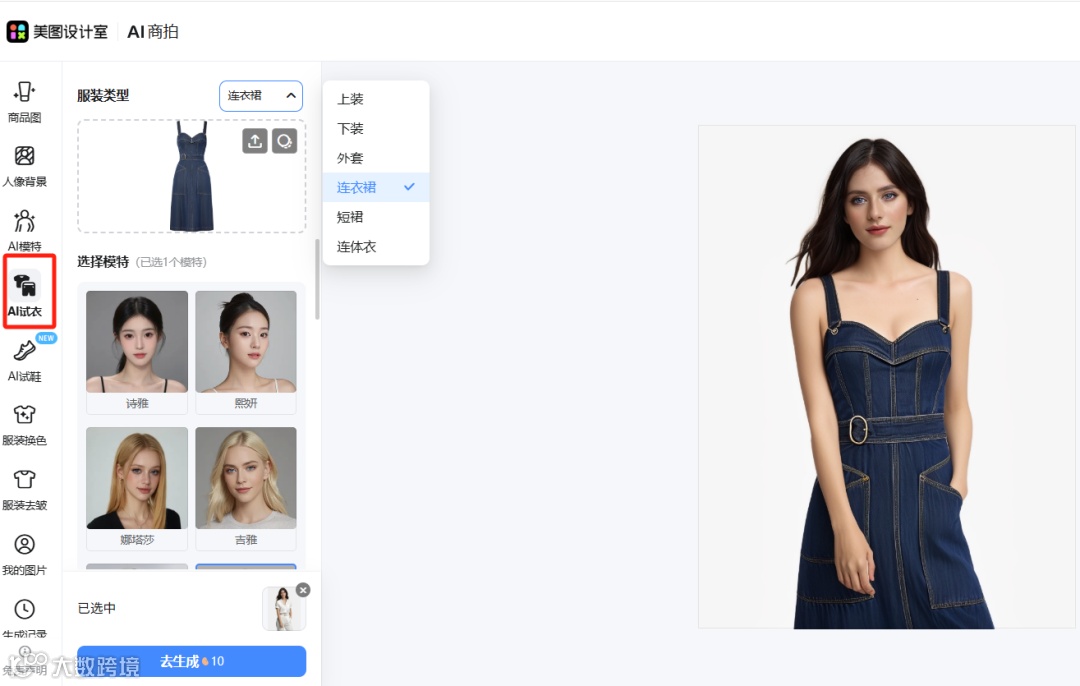 AI试衣:仅需一张衣物平铺图,选择目标模特模板即可生成真实试穿图。