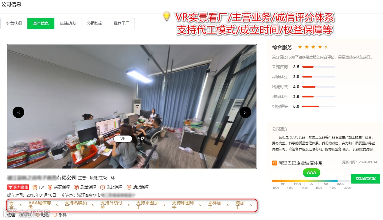 在筛选时,首先查看供应商的类型,分别是超级工厂、实力商家、诚信通标志。之前有过详细的介绍,感兴趣的商友可以去看看《一篇文章带你了解1688超级工厂、牛头实力商家、诚信通》一般来说,拥有这几个标志的供应商相对更可靠。其次,关注店铺的经营状况、信用等级、近期成交、综合服务评分等、例如比较高综合评分意味着该供应商有较多的交易记录和较好的交易评价。
