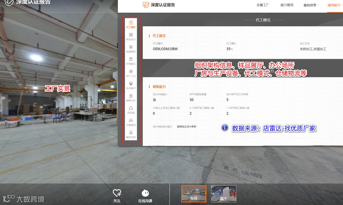 用店雷达筛选优质源头厂家就可以足不出户在线对各行业各类目的源头工厂进行初步的实景考察,除了有助于判断供应商是否具备按时、按质、按量交货的能力,同时一般支持实景看厂的都是开通了1688深度认证报告的工厂,深度验厂是1688委托第三方做的检测报告,真实性有保障。