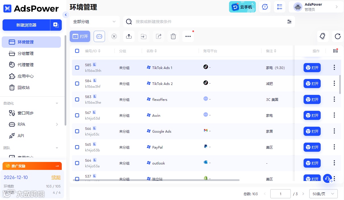 当 1 个账号能稳定盈利(比如日赚 50 美元),就可以用 “多账号 + 多平台” 放大。比如利用 AdsPower 再开 2 个 Google Ads 账号测新 offer、3 个 TikTok Ads 账号测不同素材,在 AdsPower 里按 “盈利状态” 分组(“稳定盈利组”“测试组”),统一查看所有账号的广告数据,不用逐个登录平台,效率能提高 3 倍。接着把在 Google Ads 盈利的 offer,复制到 TikTok Ads 投(换适配短视频的素材),比如露营椅在 Google 靠 “搜索关键词” 转化,在 TikTok 靠 “场景化短视频” 转化,多渠道分流风险,也能扩大收益。