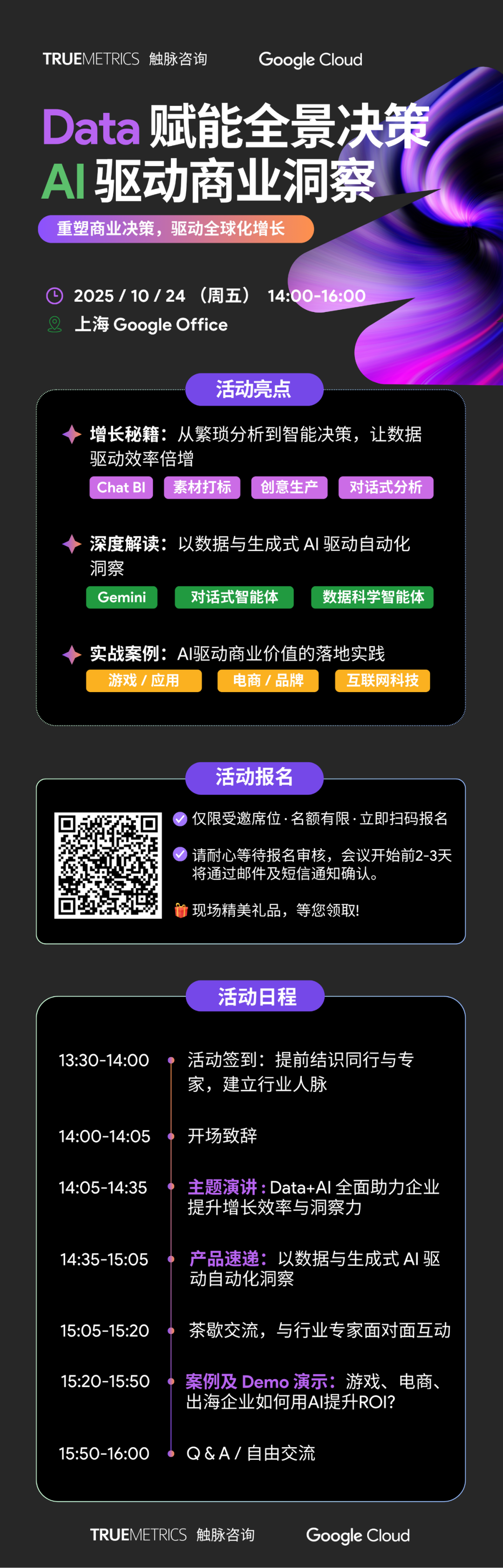 TRUEMETRICS(触脉咨询)成立于2012年。目前是 Google Marketing Platform(GMP)官⽅认证合作伙伴以及Google Cloud Platform(GCP) Resell 和 Service 认证合作伙伴。是更全面的OneGoogle生态(GMP+GCP两大核心平台)数据咨询服务及解决方案提供商。