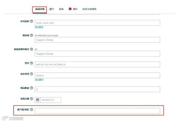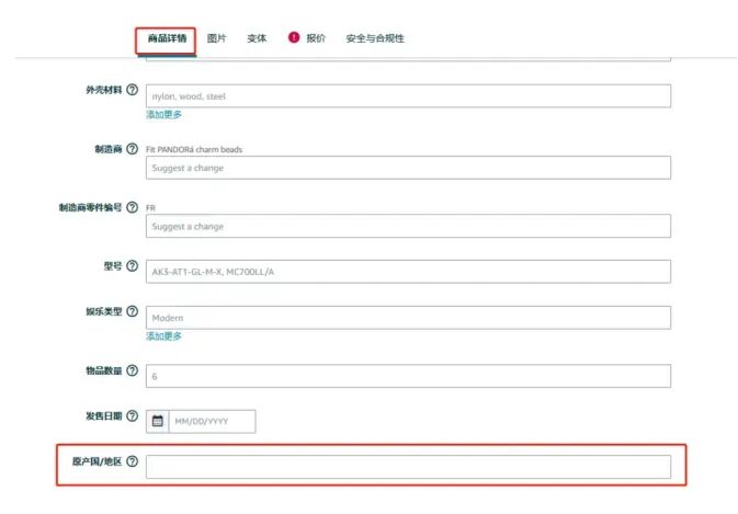 管理所有库存 > 找到需要更新的商品 > 点击目标SKU选择“编辑商品信息”> 在选项卡中找到原产地字段进行编辑:安全与合规、商品详情、报价、更多详情。