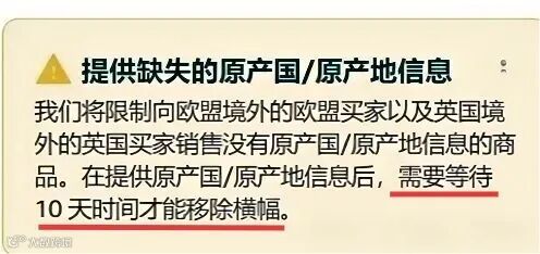 通知中也表示卖家在补充完原产国/原产地信息后,需等待10个自然日,平台才会移除商品页面的相关合规提醒横幅。