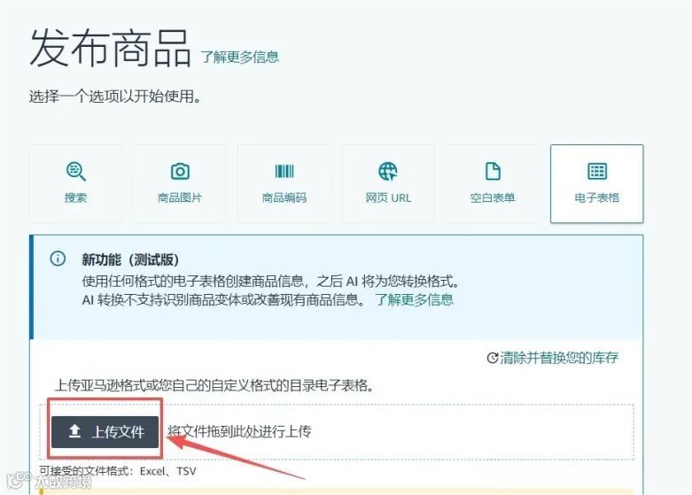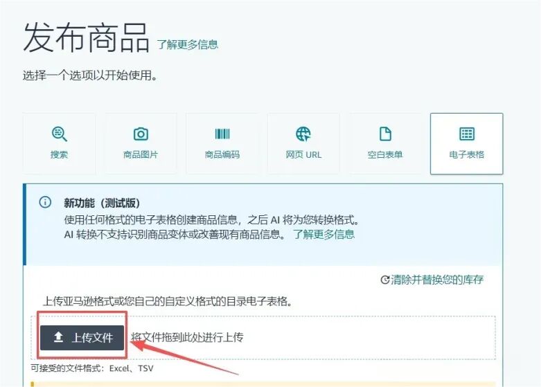 目录 > 批量上传商品 > 上传文件,选择已补充完信息的表格文件,确认无误后提交商品信息。