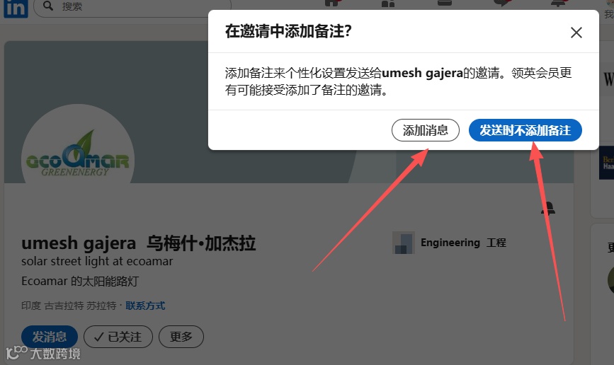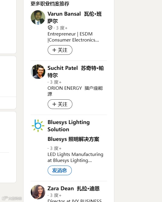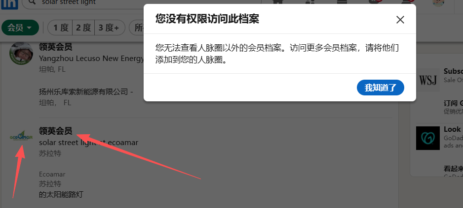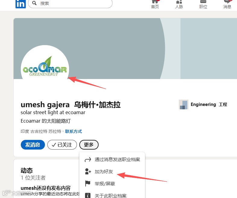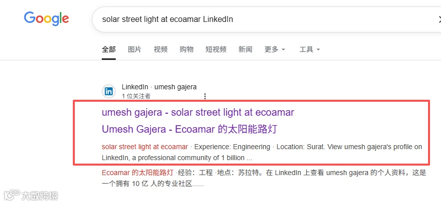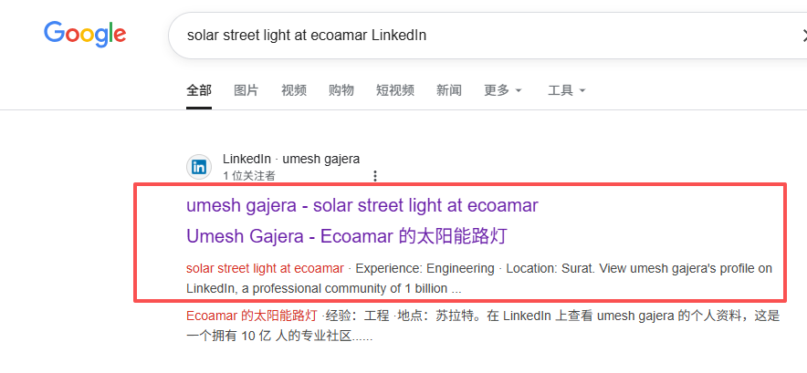 找到那位显示为“领英会员”的用户,将其职位描述(例如:solar street light at ecoamar LinkedIn)完整复制到谷歌浏览器。