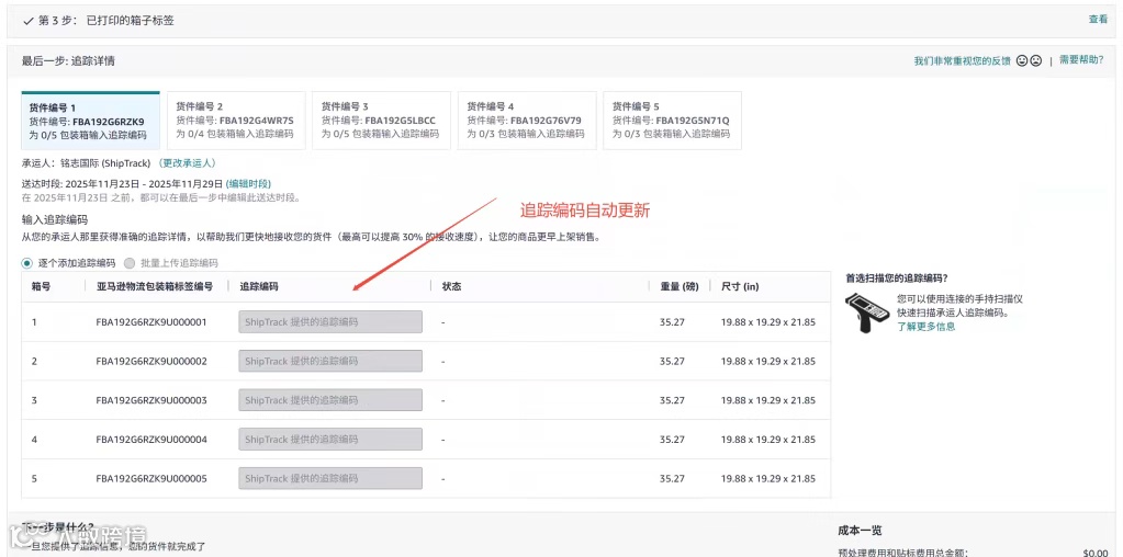 只要你选择用亚马逊后台的ShipTrack承运商发货,物流单号就会自动显示在卖家平台的“货件一览”页面,不用各个平台来回切换查询了。