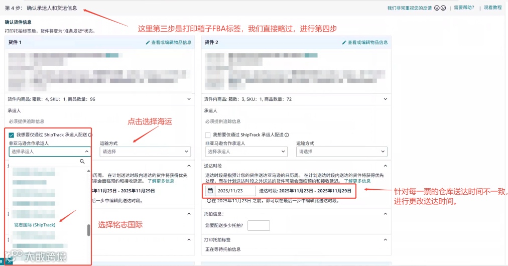 2、如果卖家尾程选择托拍配送,请在“第4步:确认承运人和托拍信息”步骤中参考下图中的承运人选项: