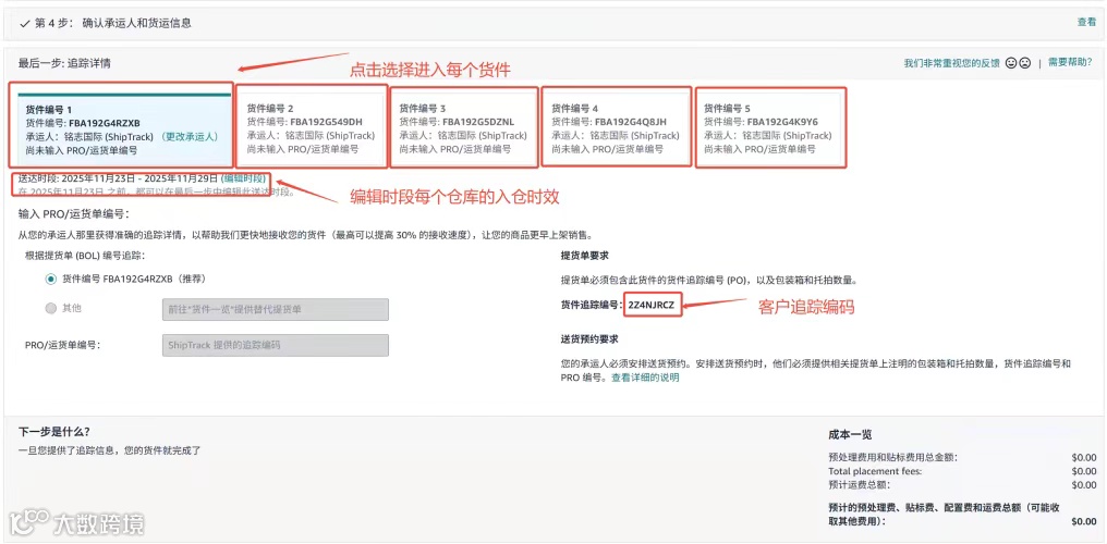 在最后一步“追踪详情”步骤中,卖家不再需要提供货件追踪单号(托拍配送不再需要填写提货单编号或者PRO/运货单编号;小包裹快递货件不再要求填写追踪编码)。