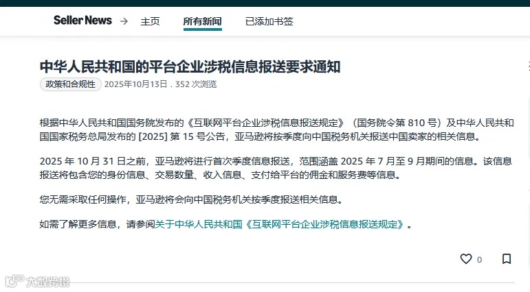 同时亚马逊将进行首次季度信息报送。早在2025年6月,国家税务总局已发布《互联网平台企业涉税信息报送规定》,要求所有允许中国卖家入驻的跨境电商平台(包括亚马逊、eBay、TikTok Shop、SHEIN等)每季度报送数据。