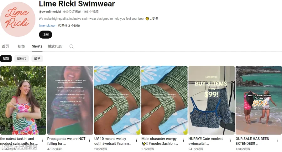 YouTube营销:YouTube是为Lime Ricki官网带来最多社媒流量的平台,Lime Ricki长期输出15秒至60秒的短视频内容,采用竖屏形式,贴合移动端用户的浏览习惯。视频多以不同身形模特的穿搭展示为主,搭配诸如“bodypositivity”“modestfashion”等标签。真实自信的穿着状态,打破了传统泳装营销中“标准身材”的单一美学预期,也帮助品牌构建出一个更具包容性与情感连接的形象。