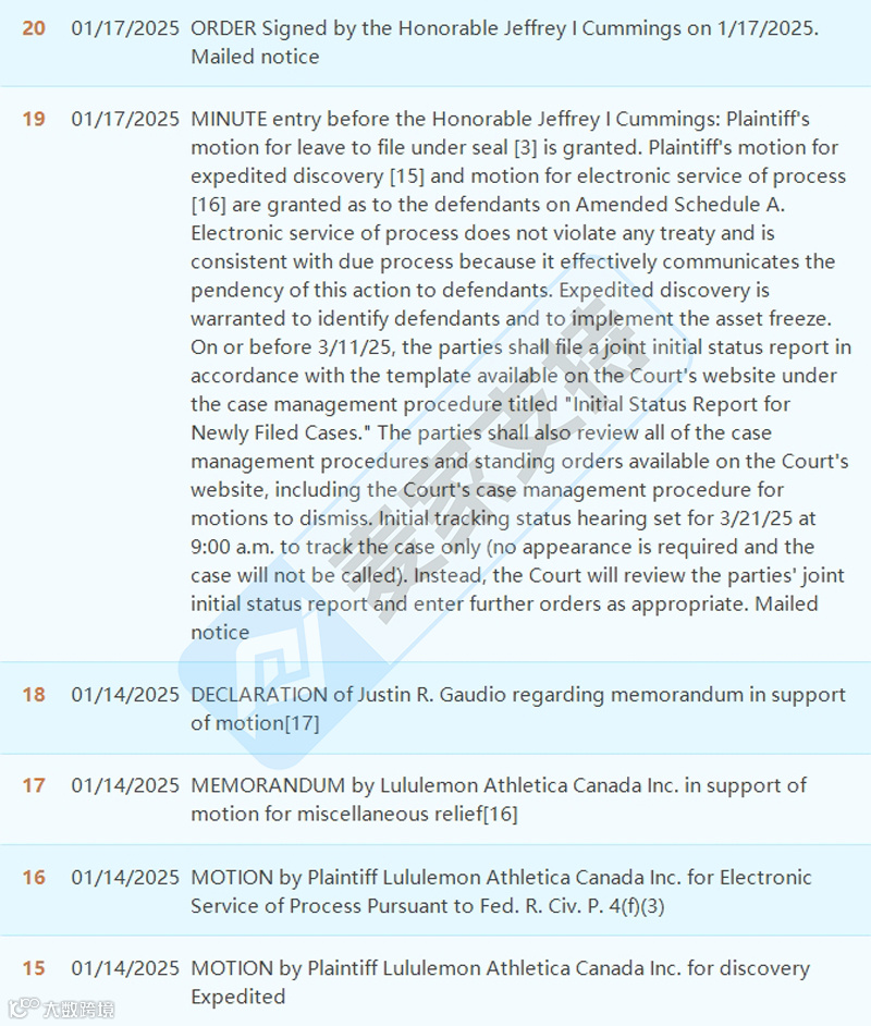 25年GBC律所代理专注于设计和销售高性能运动服装的Lululemon多个商标重拳出击,多次发起维权,不仅涉及文字商标和涉及多个图形商标,跨境卖家均需留意,未经授权上架销售均会面临TRO冻结风险。