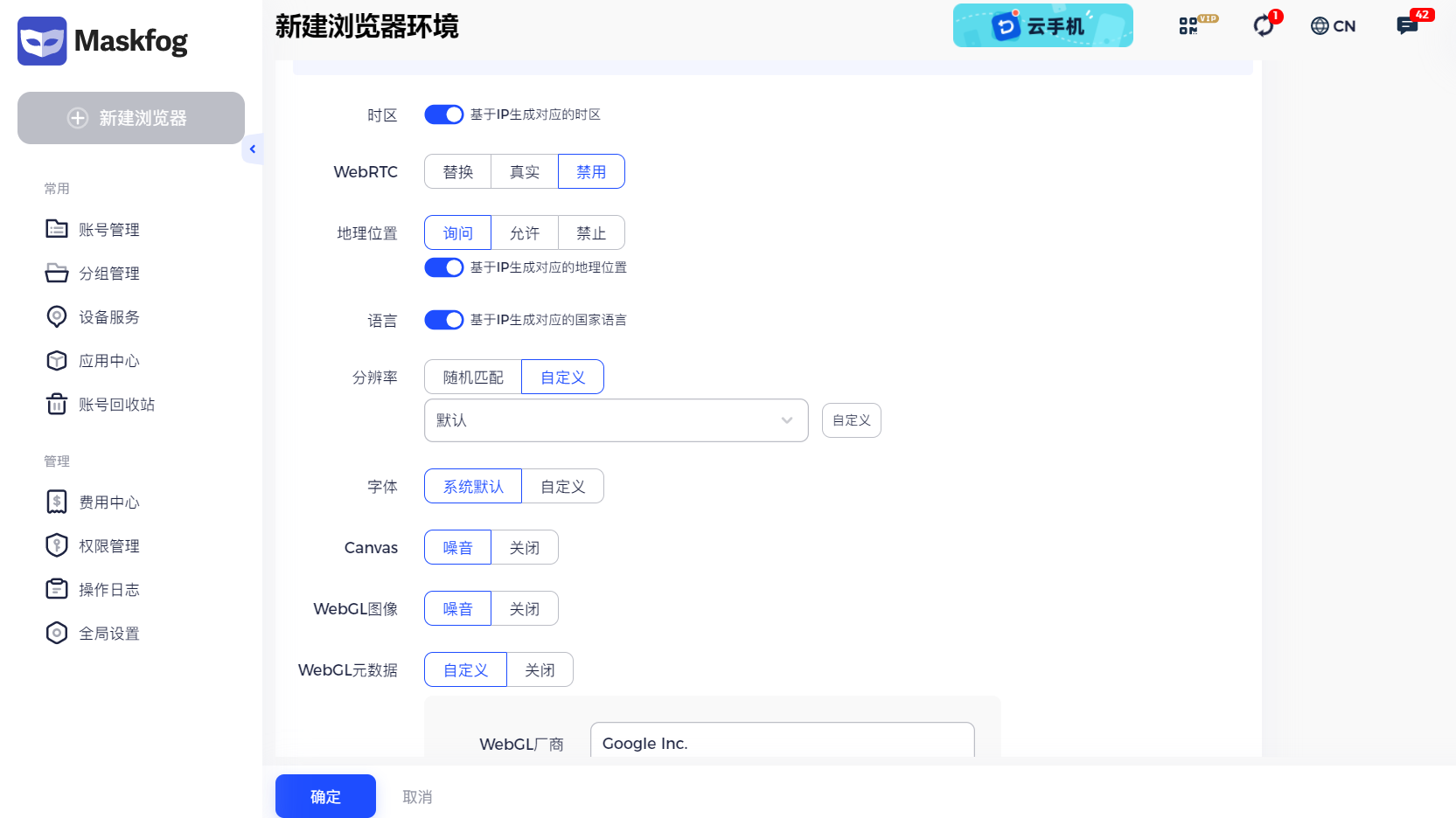 MaskFog 能在几秒钟内为你生成一个隔离、伪装、拟真的浏览器环境,帮助你避免平台风控系统的指纹关联。