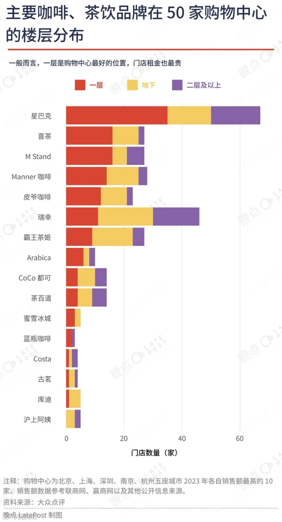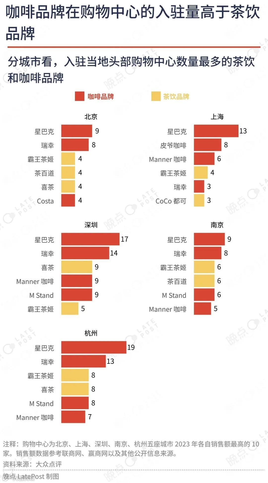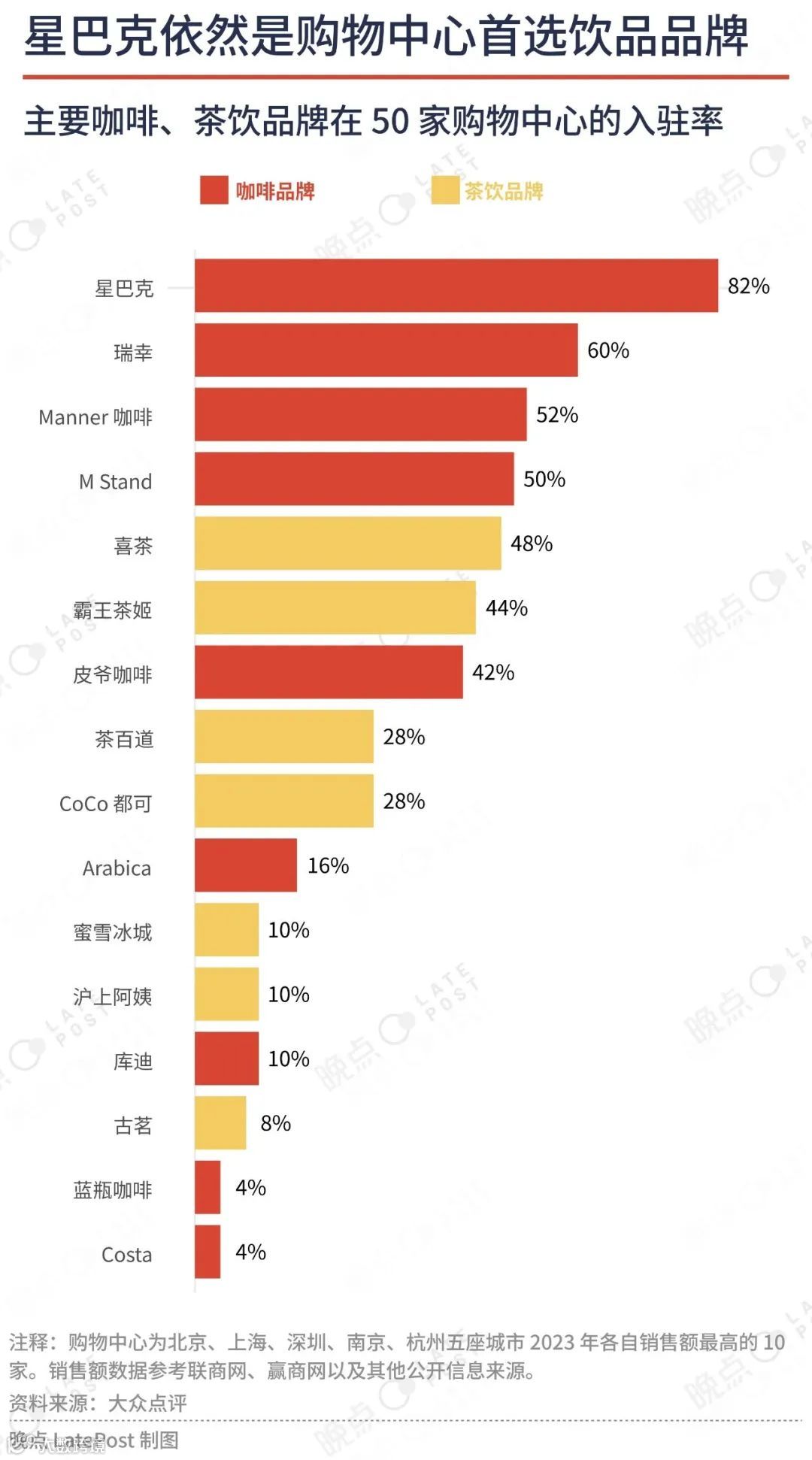 《晚点 LatePost》统计发现,购物中心入住率最高的依旧是咖啡品牌。茶饮品牌中,喜茶是入住率最高的茶饮品牌。