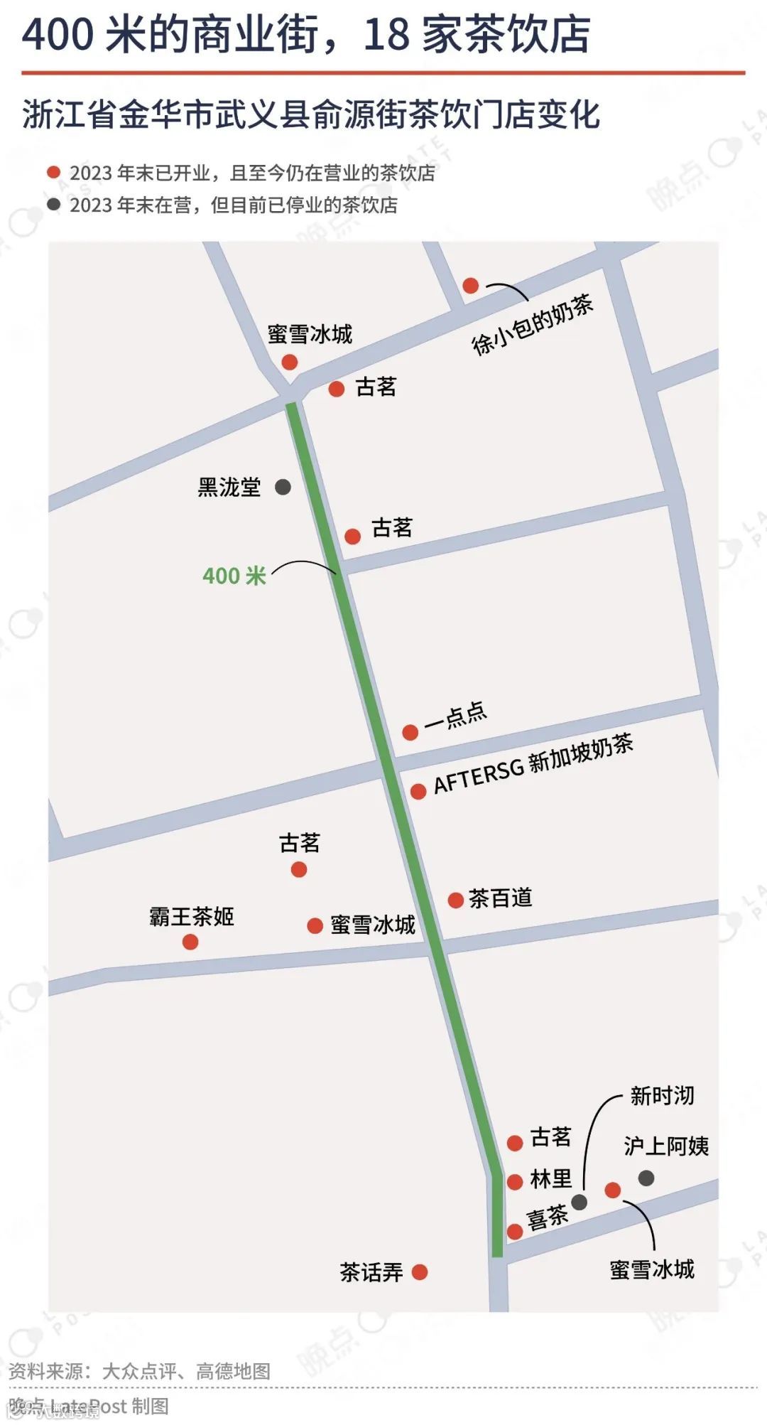 2023 年,我们走访过浙江省金华市俞源街。400 米的街道,两侧开了 18 家奶茶店。发稿前,我们在地图上重新搜索这条街,发现门店少了三家。
