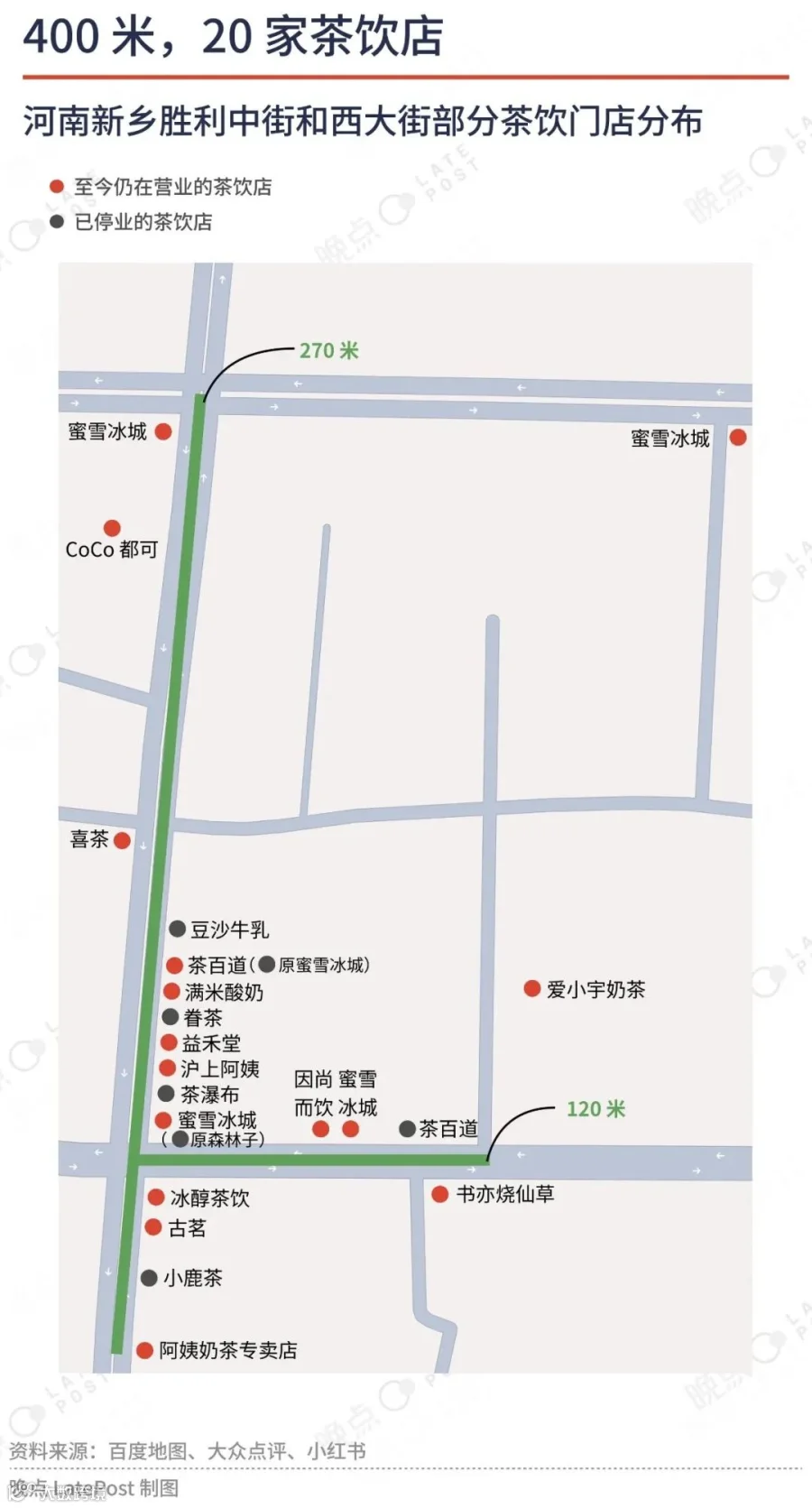 而在河南新乡的一条著名奶茶街,400 米的丁字路口曾经开出 20 家,现在剩下 16 家。