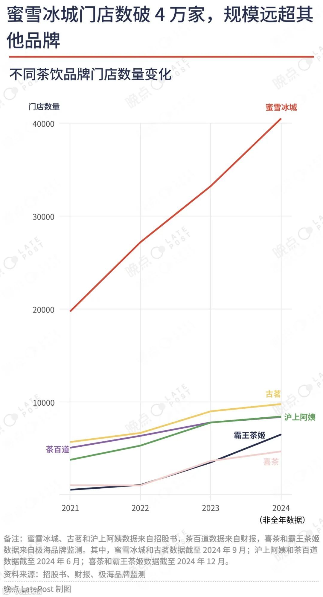 到 2024 年结束,蜜雪冰城更新招股书时,它又新开了 1 万多间门店,总数突破 4.5 万。行业二、三、四名规模都没能越过万店,古茗、沪上阿姨、茶百道都停在八九千间。霸王茶姬 6433 间、喜茶 4548 间。