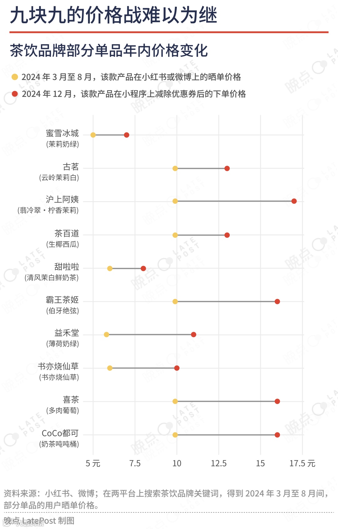 2023 年夏天,茶饮开始价格战。茶饮品牌在小程序、微信群或直播间发券,或者直接将某些 SKU 降到九块九,但茶饮因原料、制作更复杂,成本一般高过咖啡,九块九竞争更难持续。