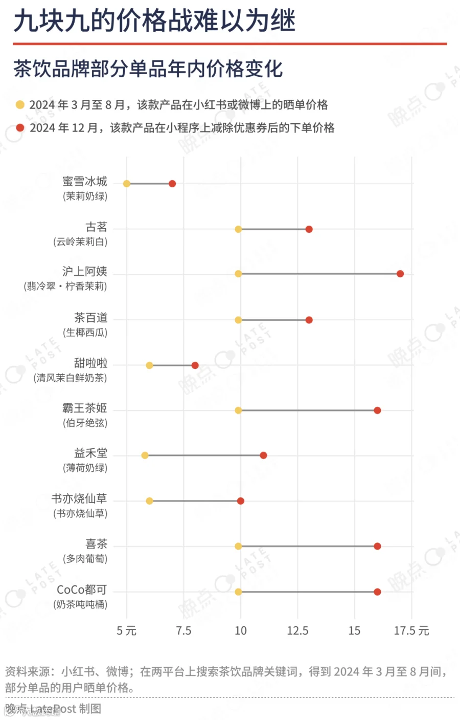各家宣告停战不久,蜜雪冰城广州、深圳、北京部分区域门店 12 月下旬涨价 1 元。涨价后,冰激凌 3 元,冰鲜柠檬水 5 元,芋泥好暖椰等产品涨到 10 元。不到一个月,瑞幸四川、浙江部分门店饮品涨价 3 元。