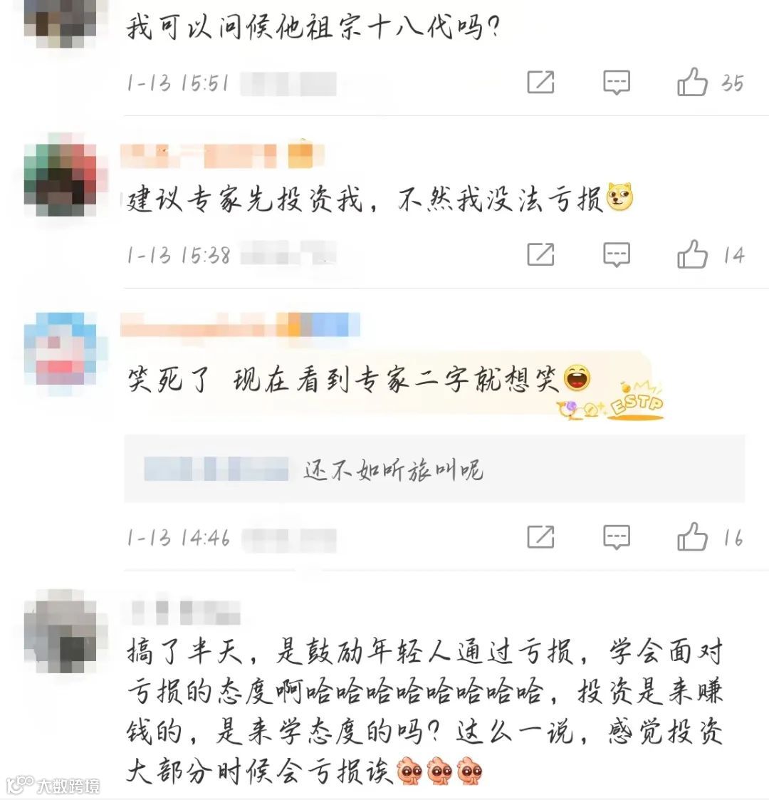 “这句话的意思是:不要因为害怕亏损而不投资,而不是叫你为了亏损而去投资。真正要担心的是不学习,不进步,下次继续犯同样的错误。看了下评论,终于明白了,为什么一些人注定亏钱……难怪我的神色如此凝重啊 ……”