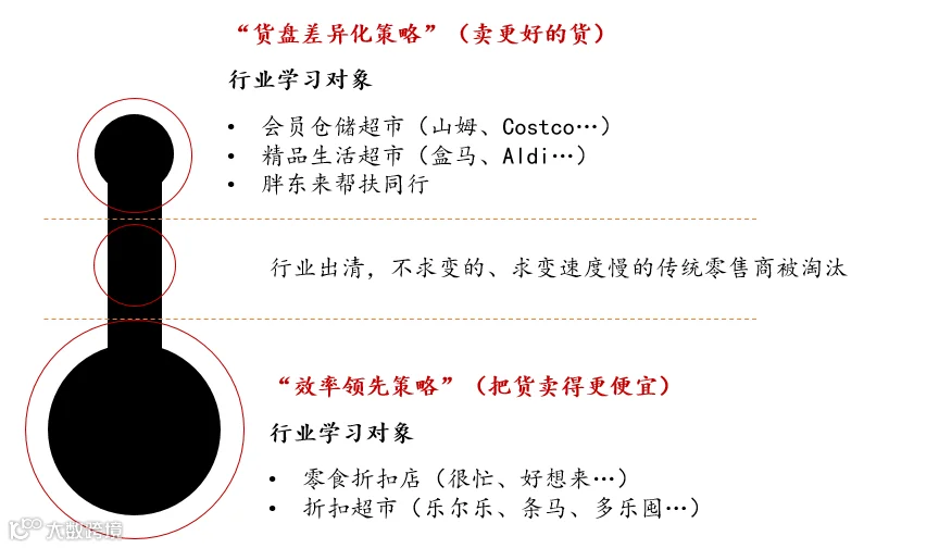 这也是当下最有效且有成功案例可参考的两种转型思路:“效率领先策略”(把货卖得更便宜)或者“货盘差异化策略”(卖更好的货)。