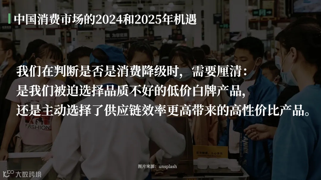 当我们讨论消费在升级还是降级时,需要厘清:是我们被迫选择品质不好的低价白牌或无牌产品,还是主动选择了更高的供应链效率所带来的高性价比产品。 -