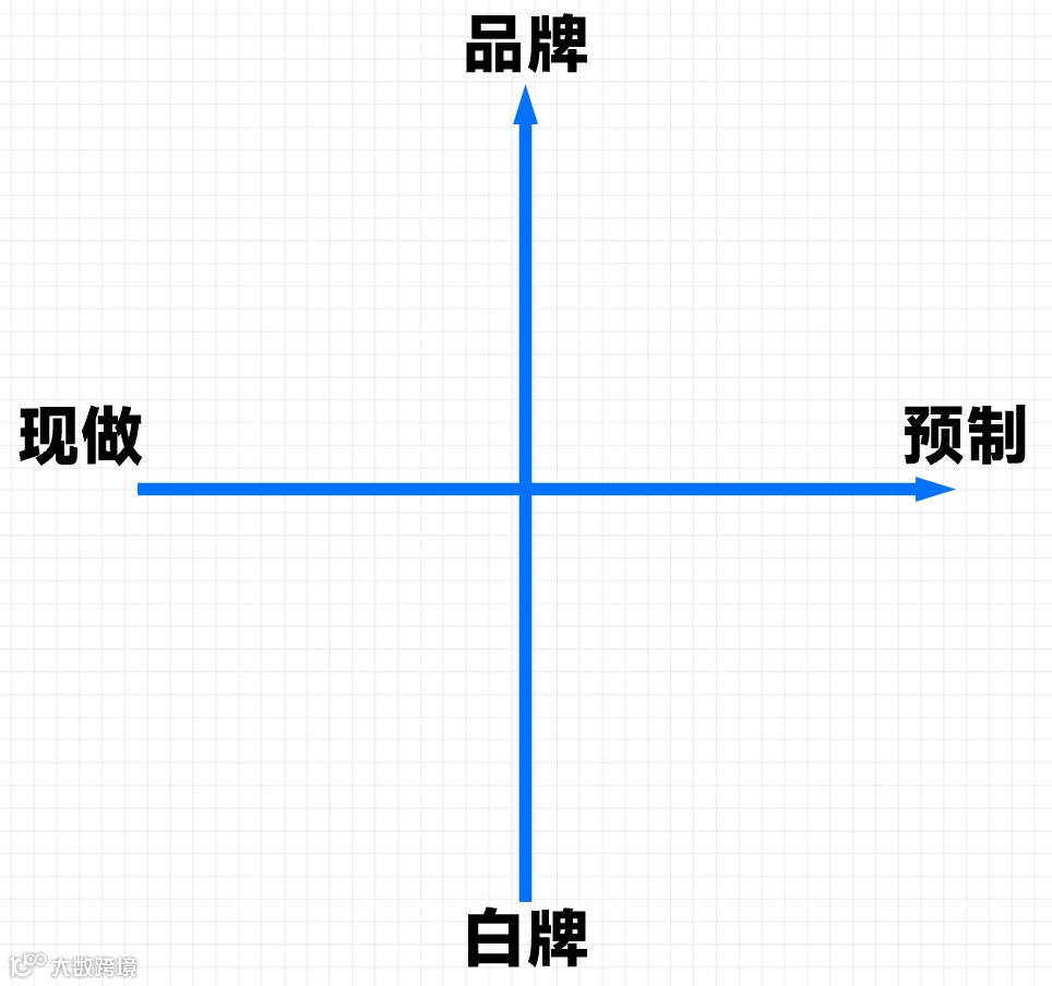 还是老规矩,把想法落在笔头上,拆一拆。现在,我们把“预制、现做”作为横轴,“白牌、品牌”作为竖轴,再来画一个二维四象限图。